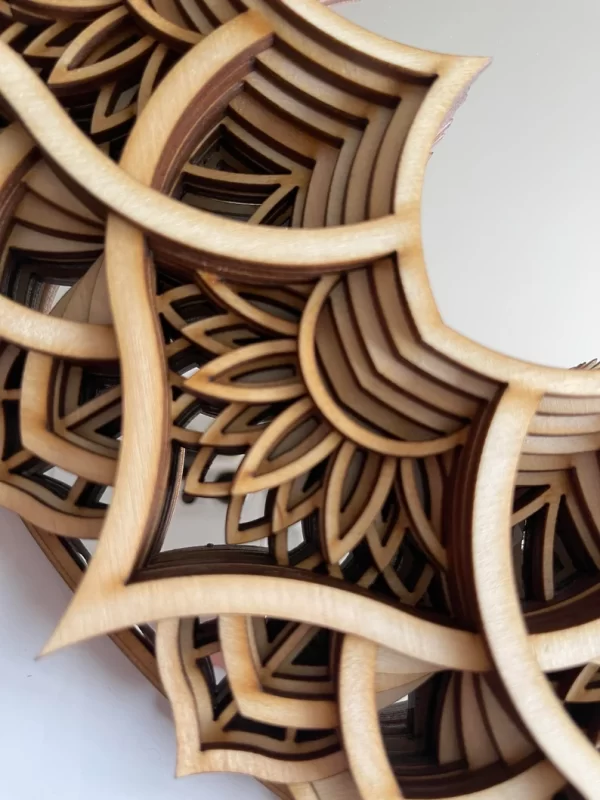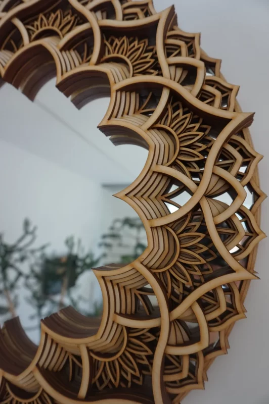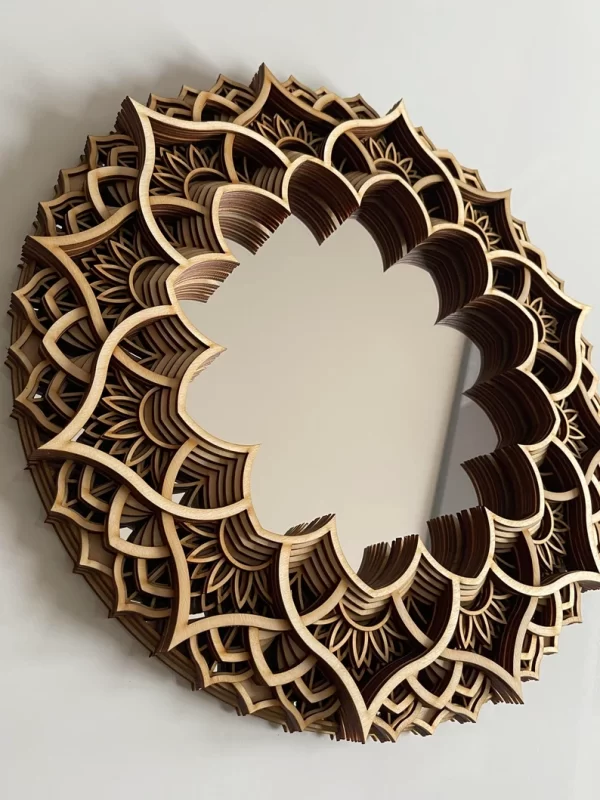 این محصول زیبا از ام دی اف سه میلی متری که لایه لایه روی هم چسبیده شده ساخته شده است که میتوانید به عنوان دکوری در محیط خود از آن استفاده کنید طراحی این قاب آینه به طوری است که از نمای مختلف به صورت سه بعدی دیده میشود و طرح آن به صورت تابلو های اسلیمی میباشد