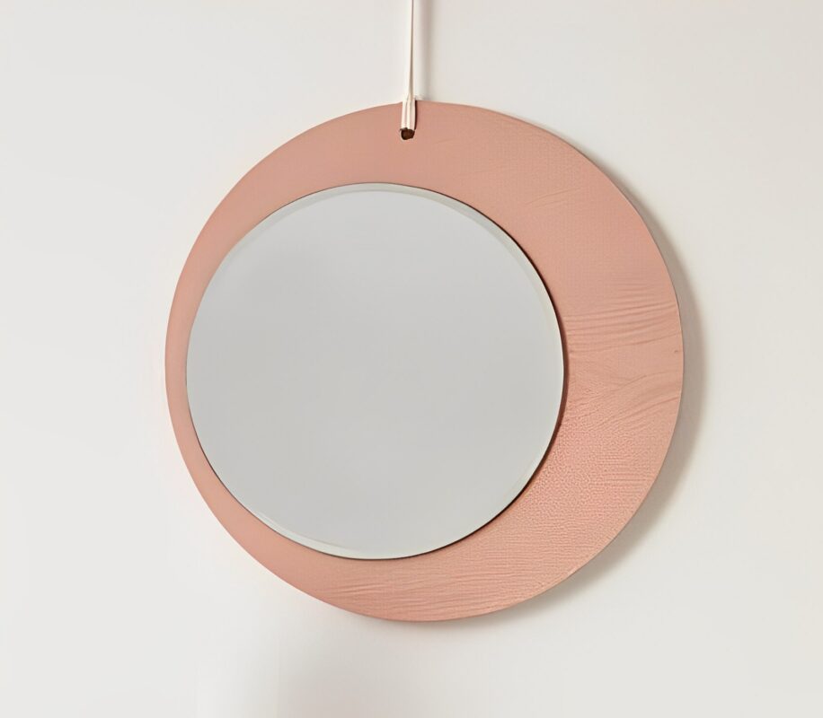 این آینه دیواری چوبی و قاب آن در فرم دایره طراحی شده و آینه آن به صورت خارج از مرکز نصب شده است.