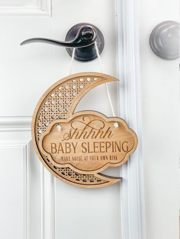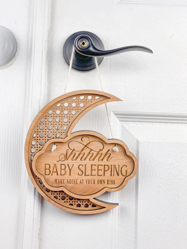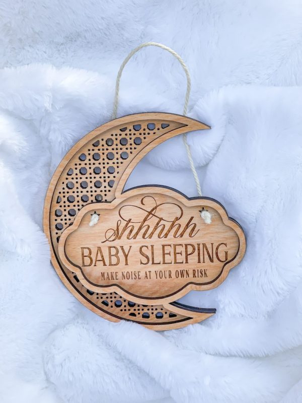 این استند آویز کاربردی از طراحی فوق العاده شیک و زیبایی برخوردار است. برای طراحی این استند چوبی از المان های ابرو ماه که تداعی کننده خواب اس استفاده شده است. ماه این استند به صورت شبکه ای و توری تزیین شده و بر روی ابر آن جمله Shhhh Baby is Sleeping. Make Noise At Your Own Risk (شششش نوزاد خوابه، سرو صدا کنه مسئولیتش به عهده شماست).