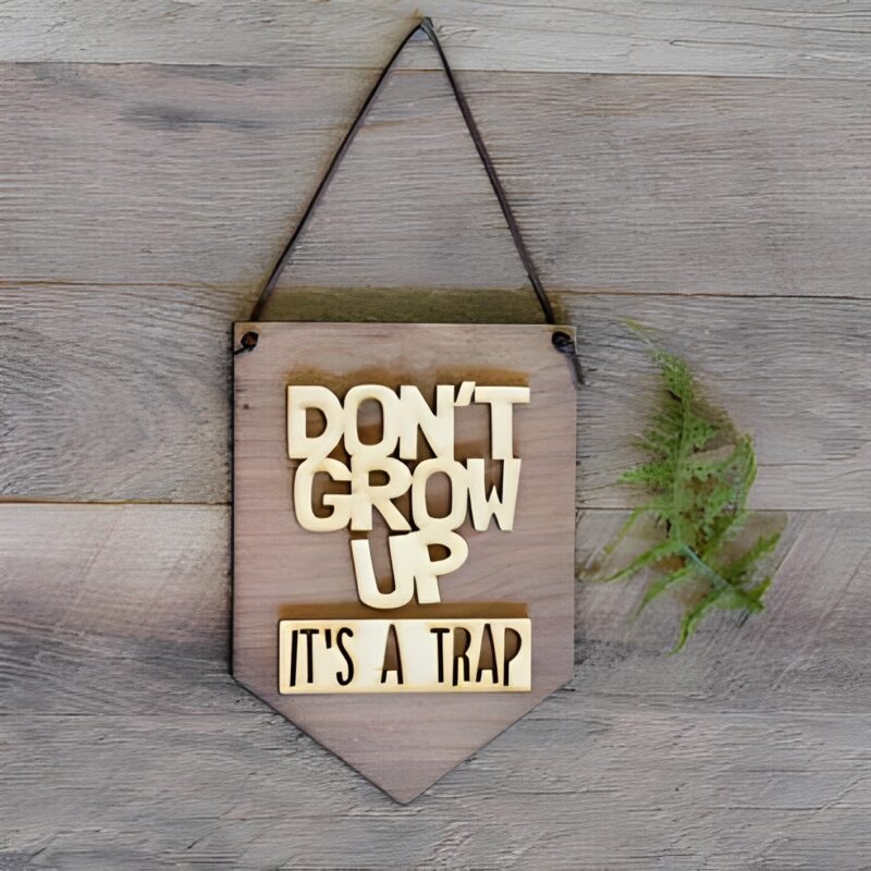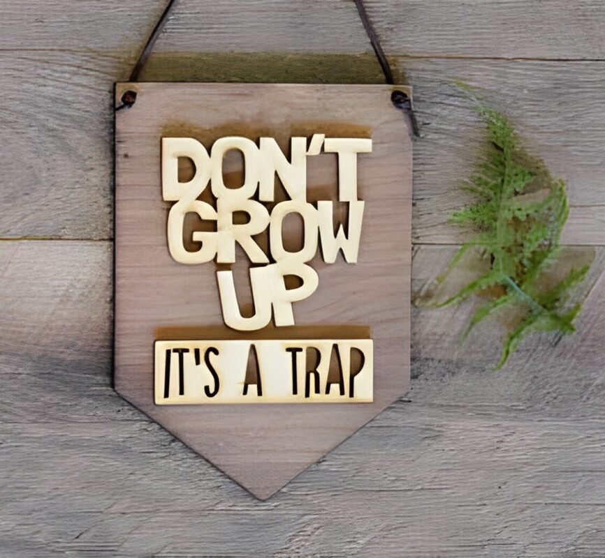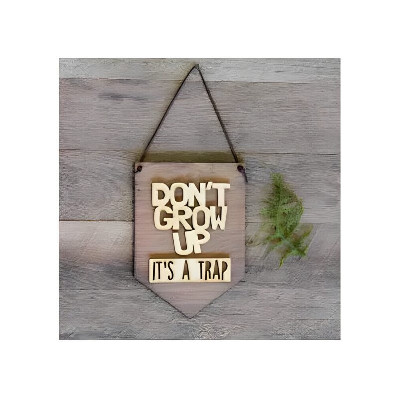استند آویز مدل TH_98362 جزو استندهای آویز و جذاب طرح و هنر است که در فرم 5 ضلعی طراحی و تولید شده است. در روی این محصول عبارت don’t grow up it’s trap (بزرگ نشو این یه تله است) به صورت برش لیزری کارشده است.