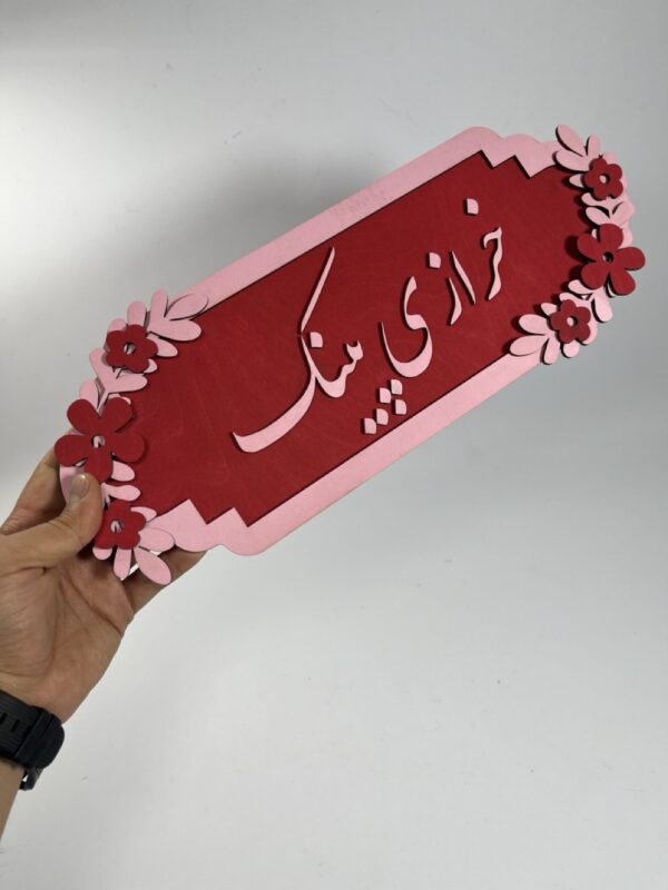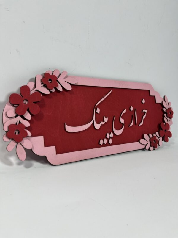 برای تزیین این محصول از گل و برگ در یک قاب مستطیل بیضی استفاده شده و اسم مورد نظرتان در مرکز این استند قرار می گیرد. شما می توانید این محصول را به صورت شخصی سازی شده داشته باشید فقط کافیست باکس قرار داده شده در سایت را پر کنید.