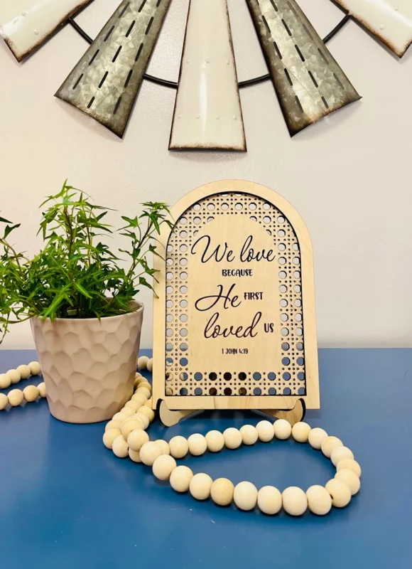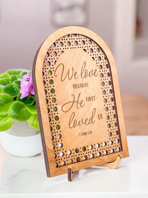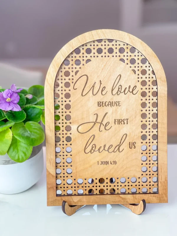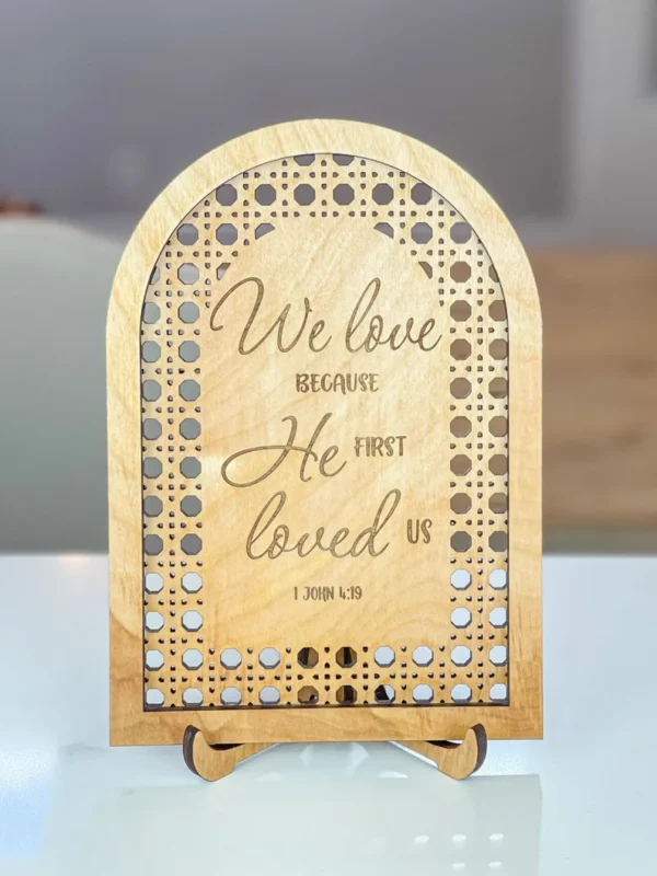 استند اسم رومیزی مدل TH_94682 طرح و هنر که به صورت طاق ایرانی طراحی شده، برای تزیین آن از واگیره های هندسی استفاده شده است. مطمئنا این محصول می تواند یک المان تزیینی شیک و خاص برای افرادی باشد که به هنر و اشیای تزیینی خاص علاقمند هستند. بر روی این استند اسم رومیزی چوبی جمله we love because he first loved us و تاریخ و ساعت حکاکی شده است اما؛ شما می توانید این محصول را به صورت اختصاصی داشته باشید. فقط کافیست باکس توضیحات قرار داده شده در سایت را بامتن کوتاه مورد نظرتان پر کنید تا محصولی که به دستتان می رسد به صورت کاملاً شخصی سازی شده باشد.
