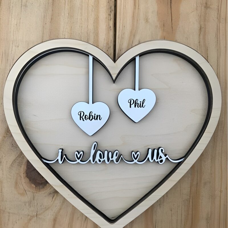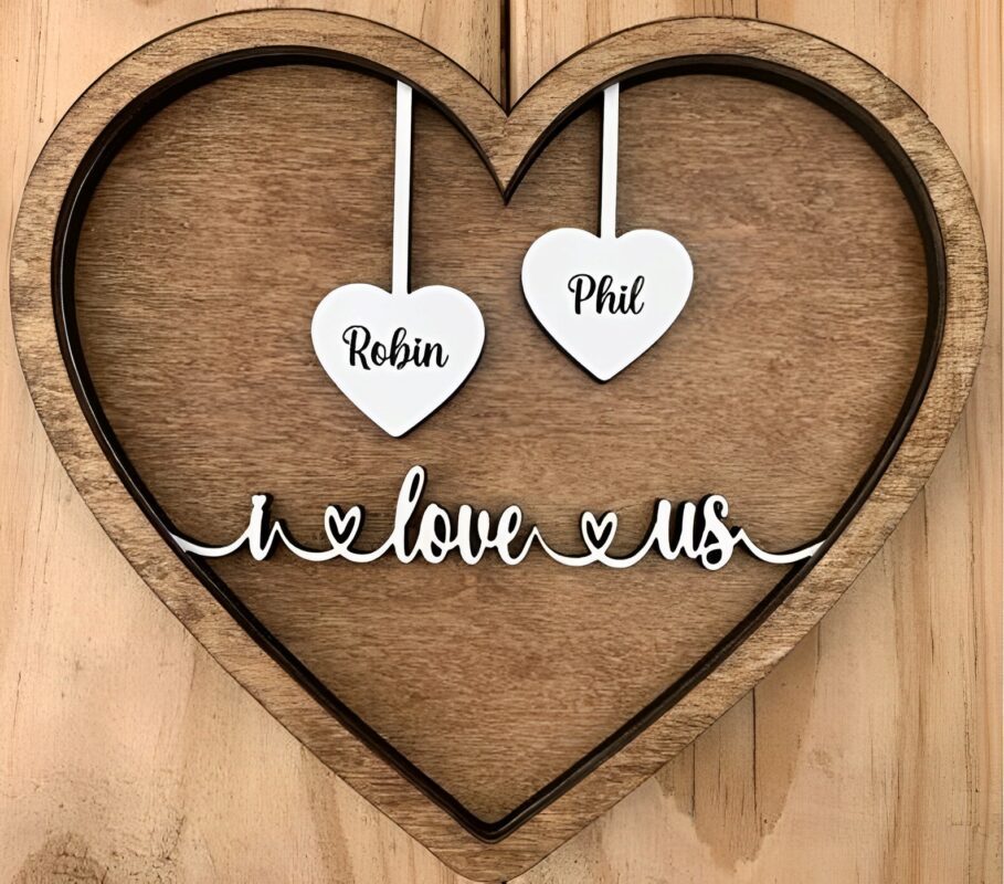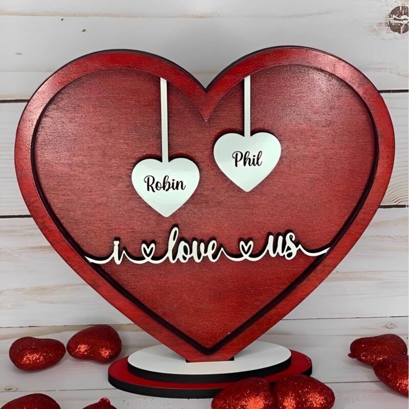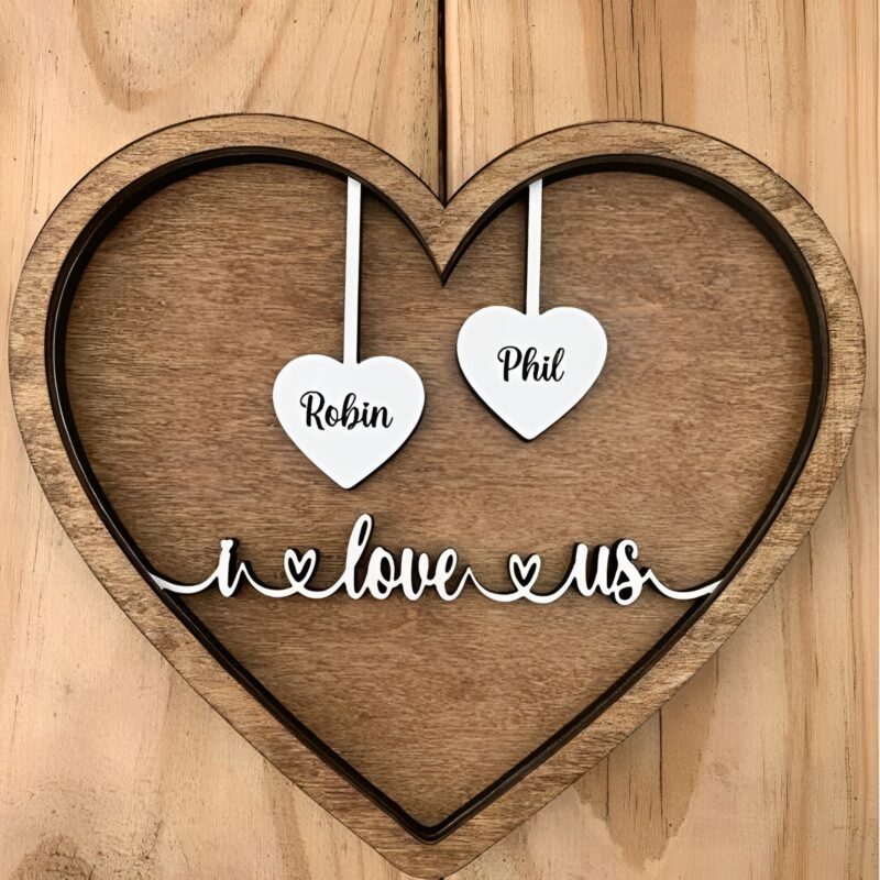 در داخل این قاب قلبی دو قلب کوچک دیگر قرار دارد که می توانید اسامی که مورد نظرتان است را در روی آن داشته باشید و در پایین این استند اسم قلبی شکل عبارت I ❤ LOVE ❤ US (عاشق خودمونم) به صورت برش لیزری دیده می شود.