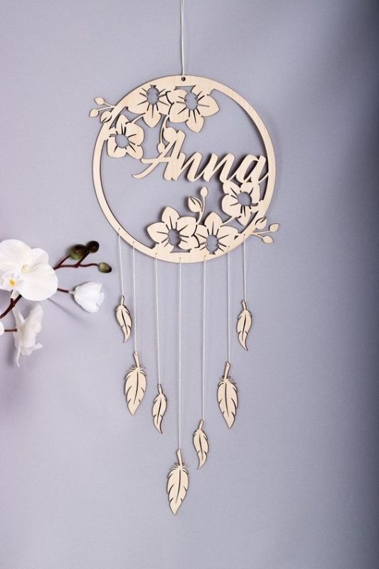 با گل های بهاری که در بالا و پایین این استند اسم چوبی طراحی شده است، نام شما در مرکز آن به زیبایی می درخشد و حس تازگی و نشاط را به نظاره کنندگان القا می کند. همچنین باید گفت برای تزیین این استند اسم آویز از پرهای چوبی متفاوت استفاده شده است.
