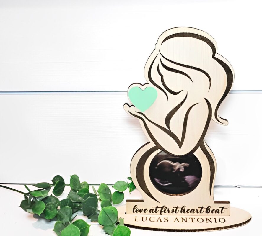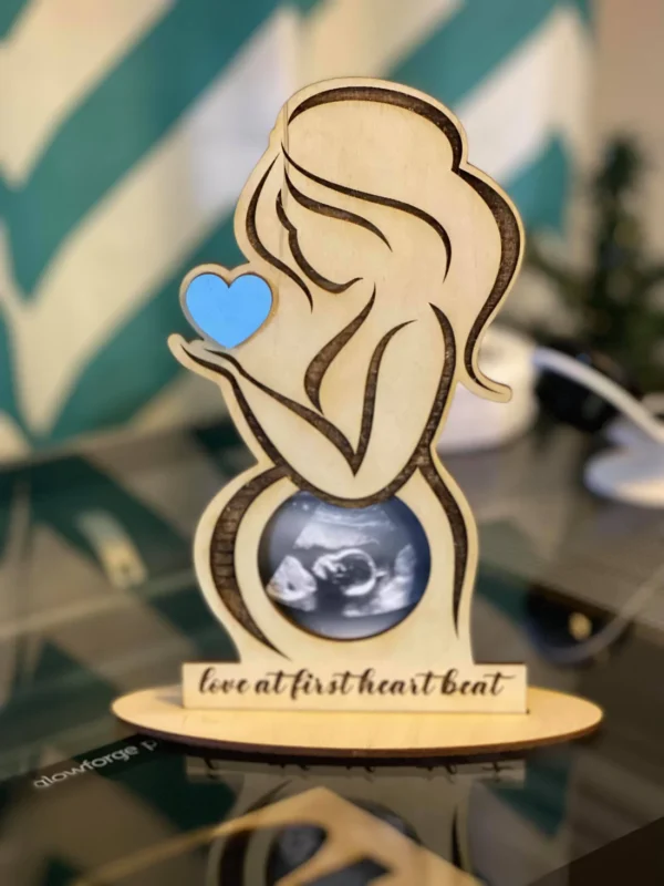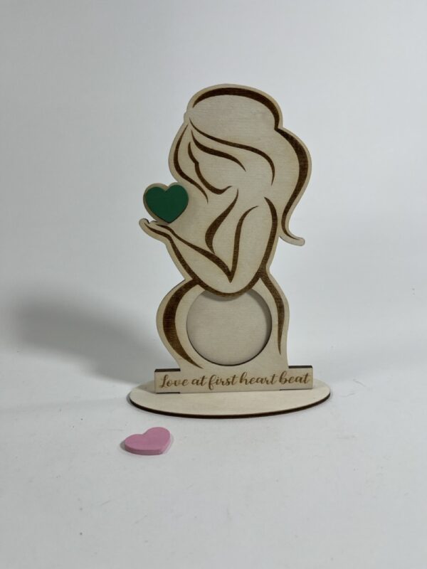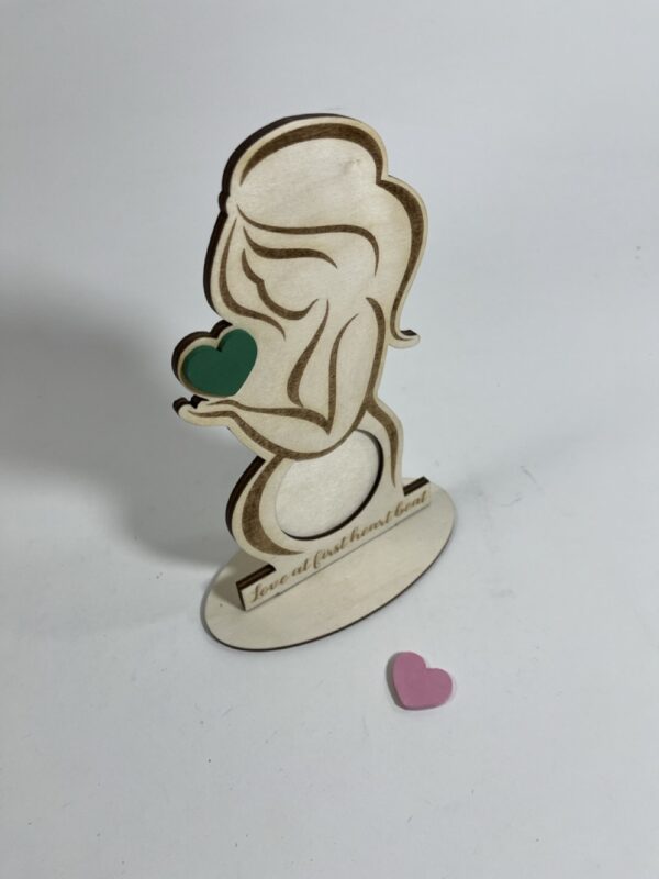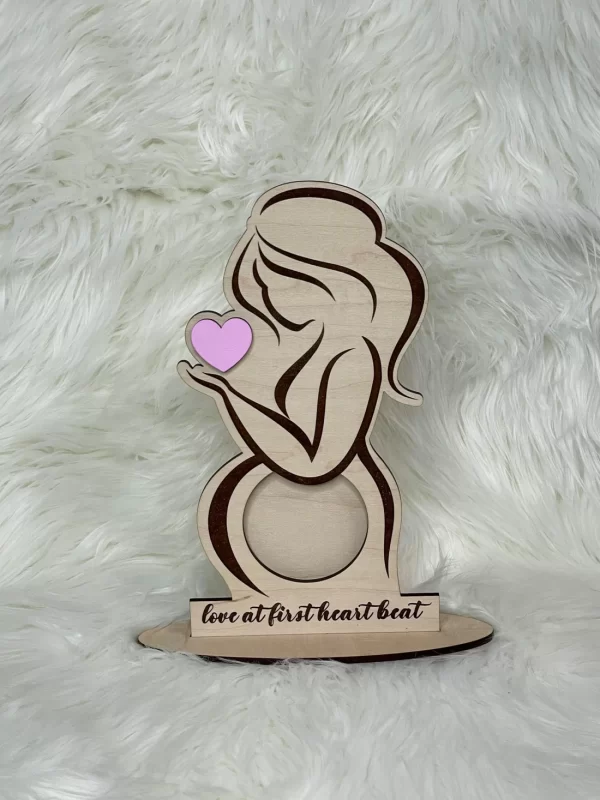 استند حاملگی مدل TH_15874 زیباترین استند رومیزی است که می توانید به عنوان قاب عکس دوران حاملگی استفاده کنید. قاب عکس چوبی زن باردار به همراه قلب رنگی برای قرار دادن تصویر سونوگرافی جنین طراحی شده است. می توانید با توجه به جنسیتی که کودک تان دارد، استند رومیزی تان را انتخاب کنید.