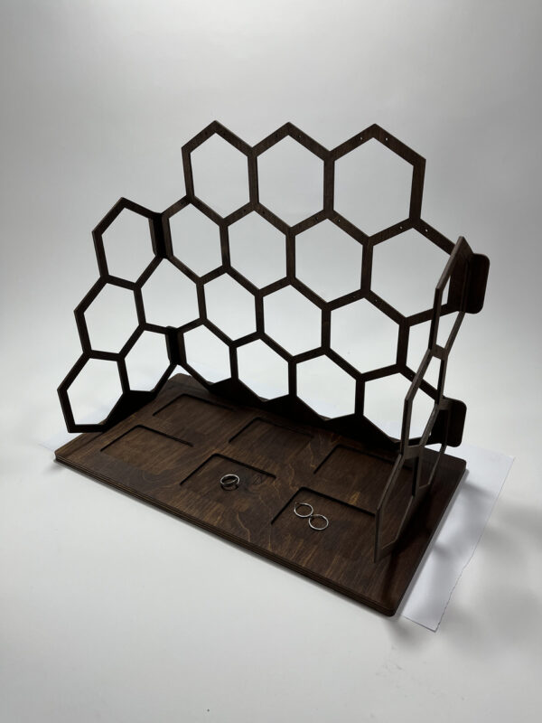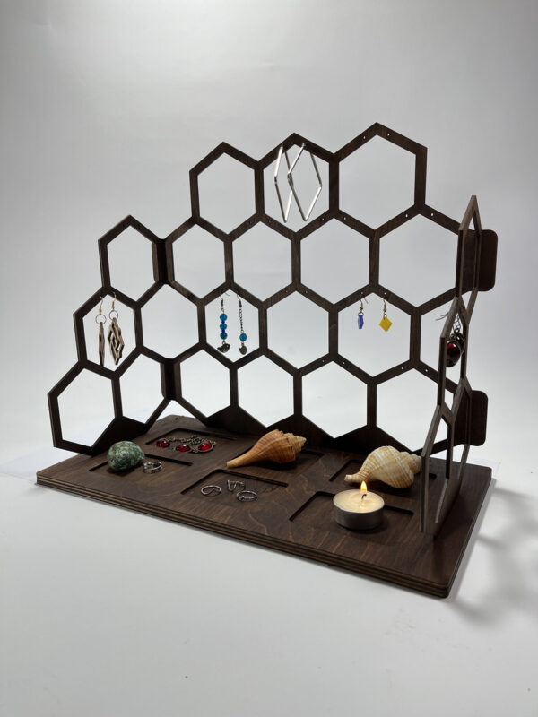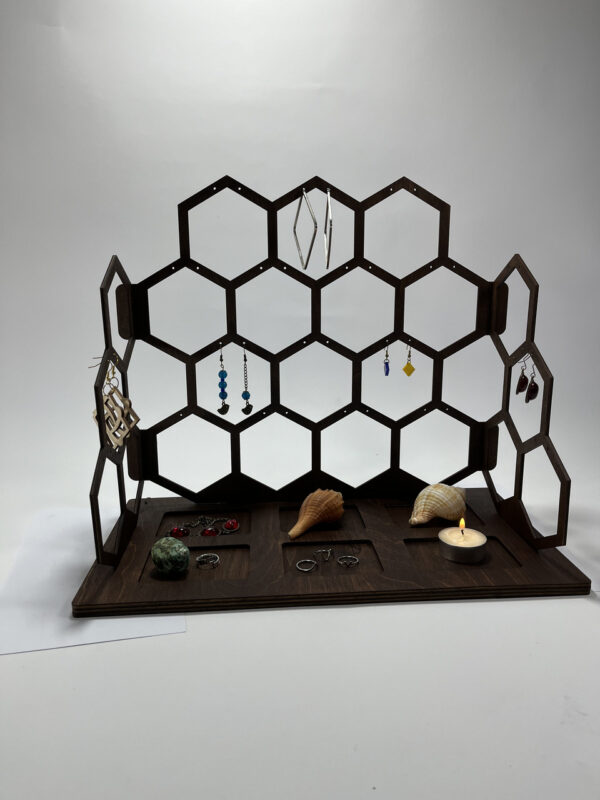 این محصول یک سازمان دهنده جواهرات عالی است و بهترین محصول برای نمایش زیورآلات تان به شمار می رود. این استند زیورآلات زنبوری شکل دارای جای مخصوص برای نگهداری از گوشواره، انگشتر، دستبند و گردنبند است. همچنین این محصول می تواند هدیه ای عالی برای هر فردی در هر سنی باشد.