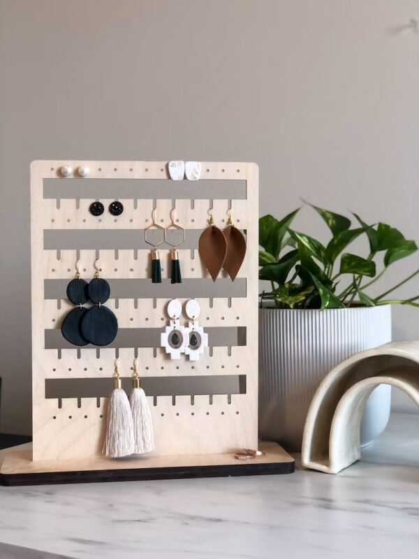 - شکافهایی برای آویزان کردن آسان انواع گوشواره های قلاب دار.