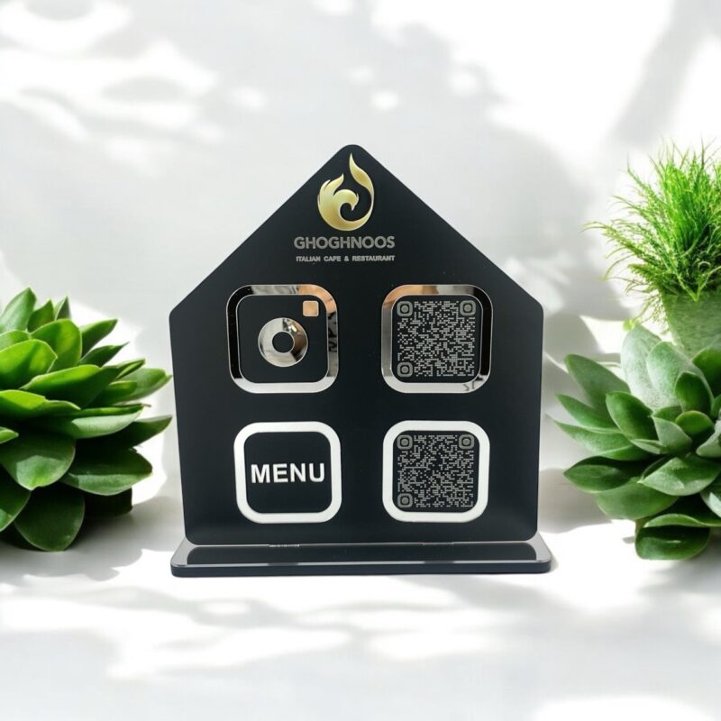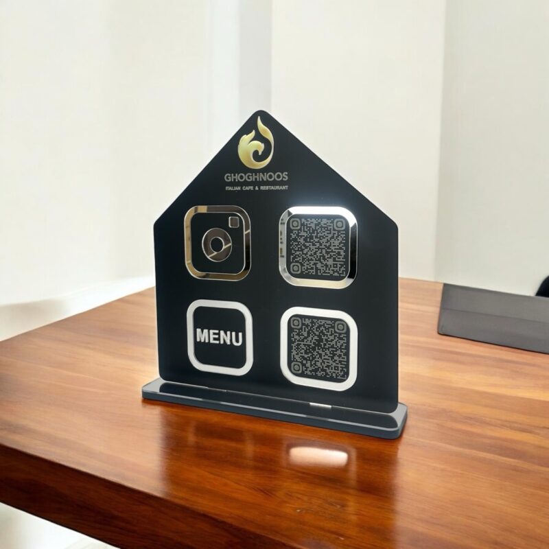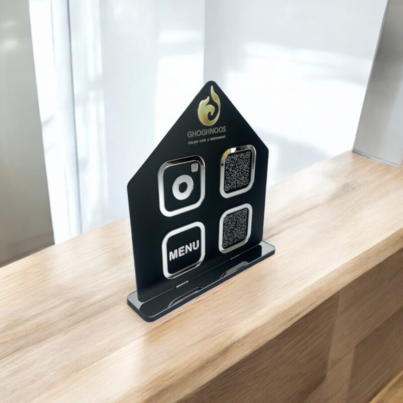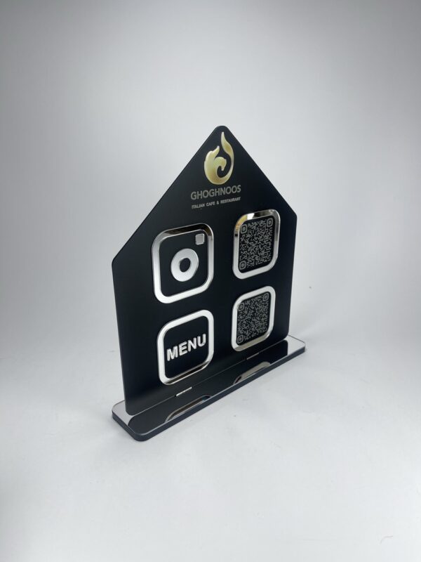 اگه دنبال یه استند شیک و کاربردی هستی که میز کافه یا رستورانت رو زیباتر کنه، استند کیوآرکد طرح خانه مدل TH_85947 بهترین انتخابه! این محصول با طراحی خاص به شکل خونه و جنس مقاوم پلکسی، یه راه راحت برای ارتباط سریع مشتریها با منو و اینستاگرام فراهم میکنه. رنگ مشکی با آیکنهای نقرهای باعث میشه که استند ظاهری لوکس و مدرن داشته باشه و به راحتی تو هر فضایی بدرخشه. علاوه بر این، امکان اضافه کردن لوگوی اختصاصی و کیوآرکد شخصیشده، این محصول رو کاملاً مناسب برای برند شما میکنه.