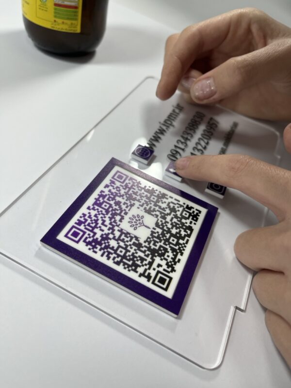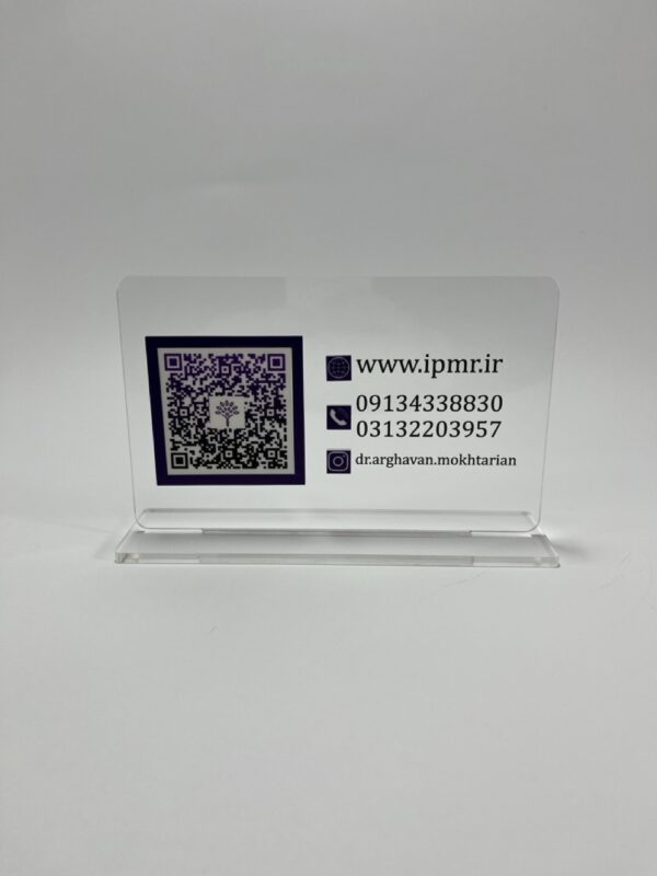 استند کیو آر کد مدل TH_12737 طرح و هنر دارای دو QR کد متفاوت است که در فرم مستطیل و به صورت رومیزی طراحی و تولید شده است.