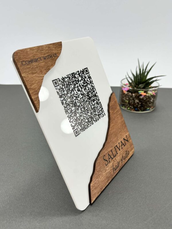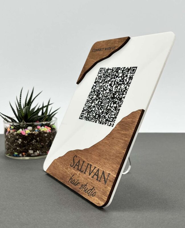 صفحه اصلی استند از پلکسی سفید ساخته شده تا چاپ QR کد روی اون با وضوح بالا انجام بشه. در قسمت بالا و پایین استند، تکههایی از چوب رنگشده با لایهبندی خاص اضافه شده که جلوهای گرم، طبیعی و متفاوت بهش داده. طراحی منحنی بخش چوبی پایینی و نوشتهی لیزرشده برند «SALIVAN» نشون میده که چقدر به جزئیات توجه شده.
