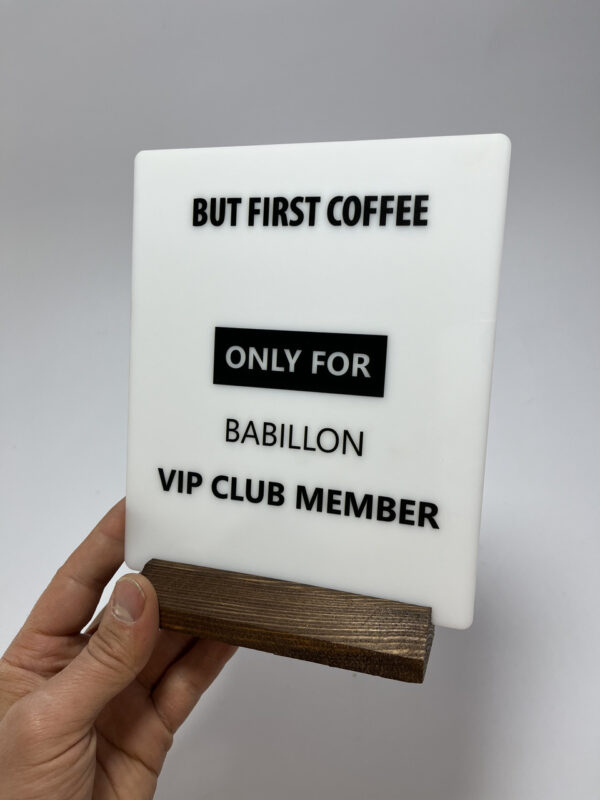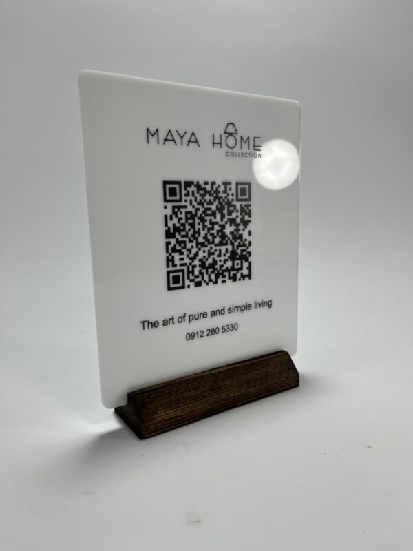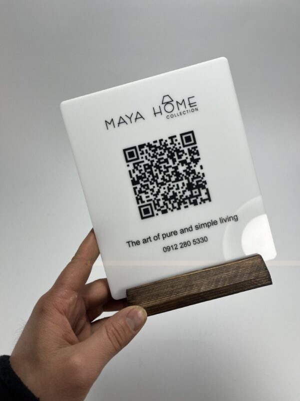 این استند از ترکیب پلکسی سفید ۳ میلیمتری و پایه چوب طبیعی ساخته شده. چاپ متن و QRکد به صورت فلتبد مشکی روی پلکسی انجام شده که ماندگاری بالا و وضوح چشمگیر داره. طراحی خطی هنری در کنار نوشته، زیبایی خاصی به استند بخشیده.