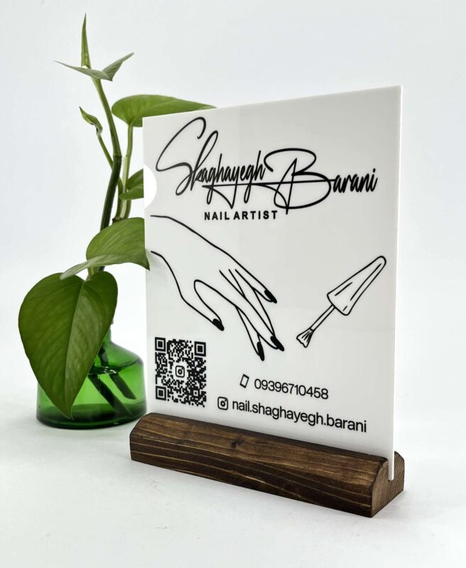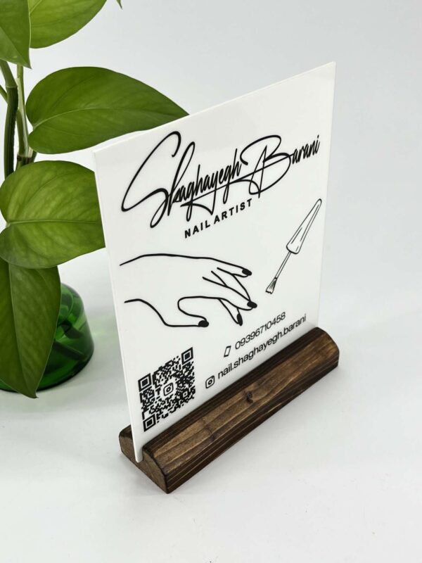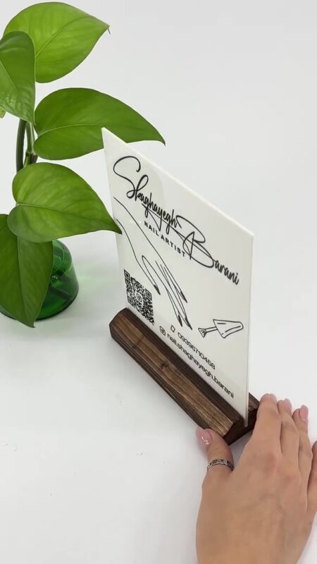 بدنهی این استند از پلکسی سفید با چاپ فلتبد بسیار باکیفیت ساخته شده و اطلاعات تماس، آیدی اینستاگرام و QRکد شما به شکل واضح و شفاف روی آن نقش بسته. پایه چوبی طبیعی، جلوهای گرم و چشمنواز به این محصول داده که بهراحتی با دکور سالن هماهنگ میشه.