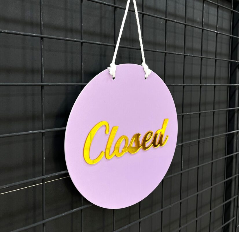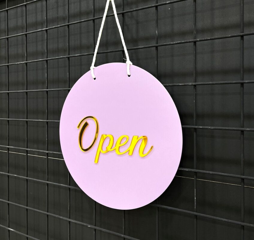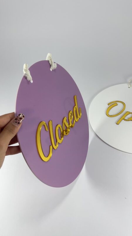 این تابلوی شیک و دو طرفه با استفاده از متریال عالی پلکسی با ابعاد 25 در 25 با طرح دایره شکل در دو رنگ صورتی و سفید ساخته میشود در طرفی از تابلو علامت بسته بودن و در طرف دیگر علامت باز بودن مکان وجود دارد .