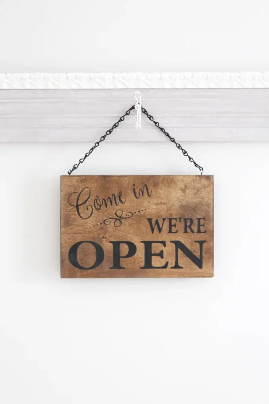 تابلو باز و بسته است مدل TH_47728 طرح و هنر که یک تابلو دو طرفه است و در قسمت جلوی آن جمله “Come in, we’re open” (بیا داخل، ما باز هستیم) و در طرف دیگر آن جمله “Sorry, we’re closed” (ببخشید، ما بسته ایم) چاپ شده است. این محصول یک تابلو چوبی عالی برای هر کسب و کاری است که می توان آن را روی در یا پنجره آویزان کرد.