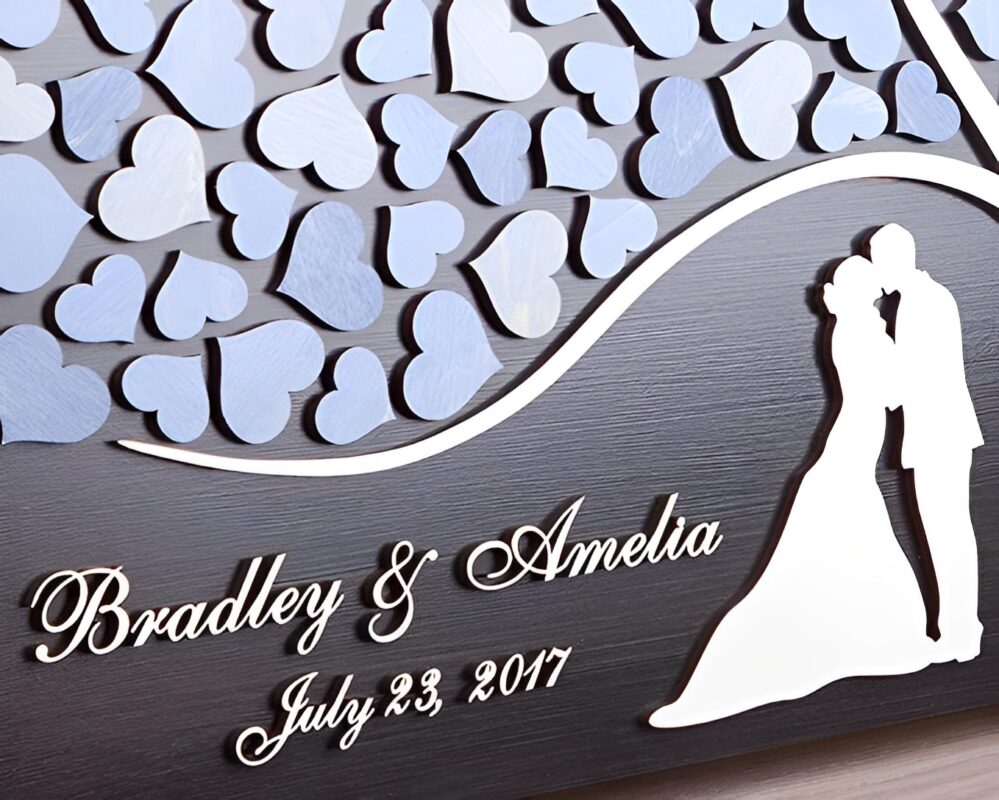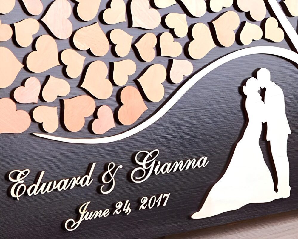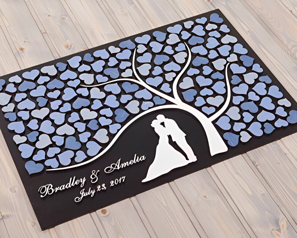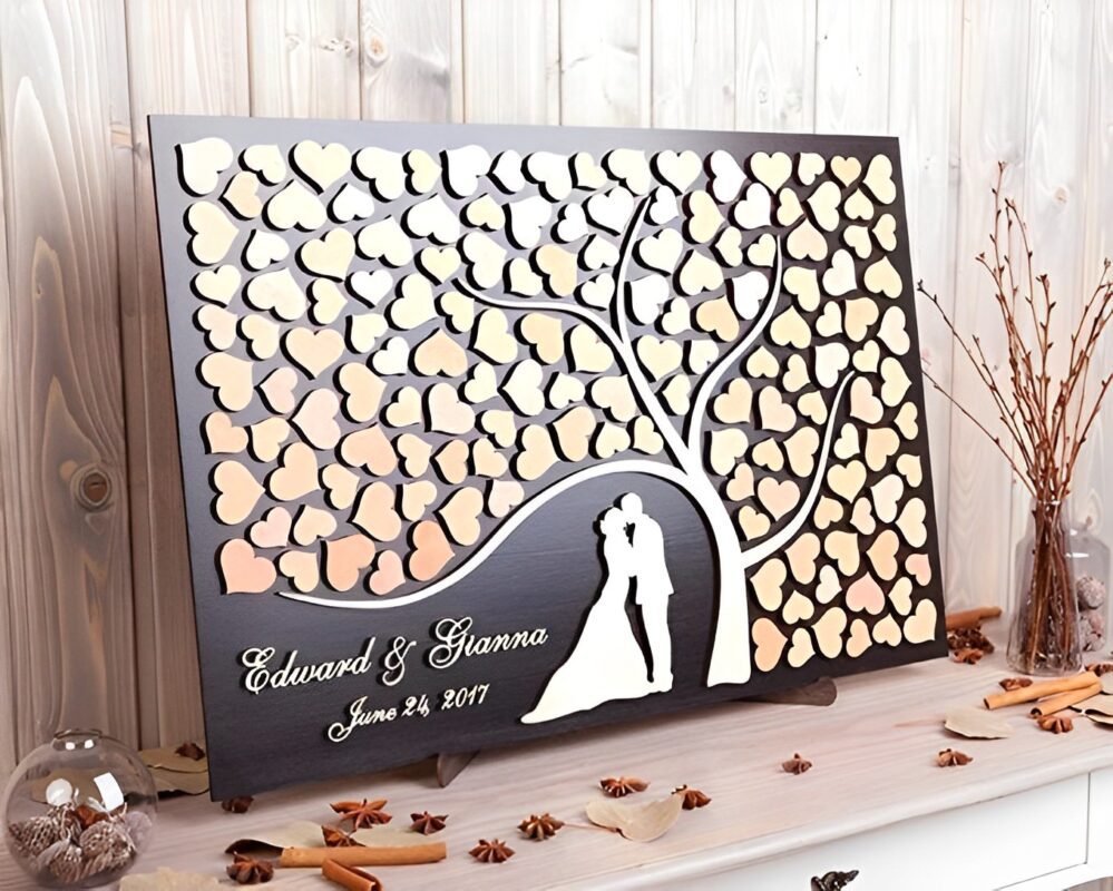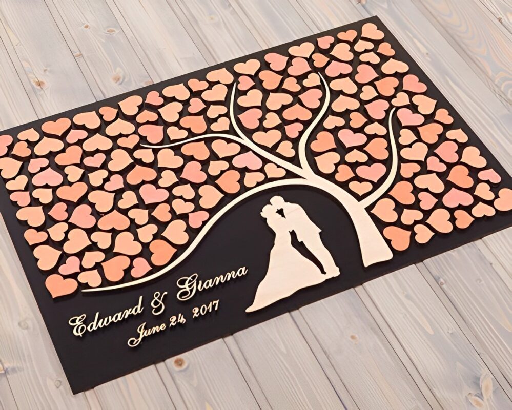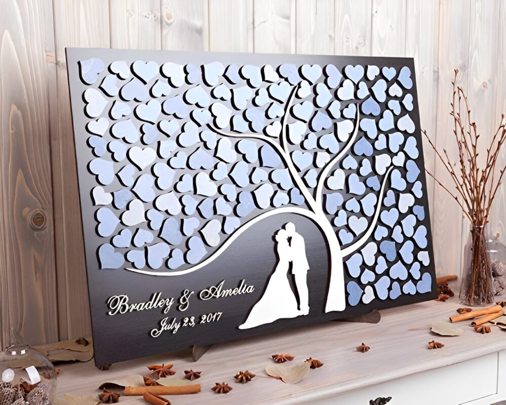 این تابلو خاطره عروسی چوبی در فرم مستطیل طراحی شده و عروس و داماد عاشقی را در زیر درخت قلبی نشان می دهد و در پایین این محصول قسمتی قرار دارد که اسامی عروس و داماد و تاریخ عقد و یا عروسی در آن ثبت می شودو اما مهمانان تان می توانند روی قلب ها پیام بنویسند یا آن را امضا کنند. شما می توانید این تابلو خاطره عروسی را به دیوار آویزان کنید و تا سال های سال از زیبایی آن لذت ببرید.