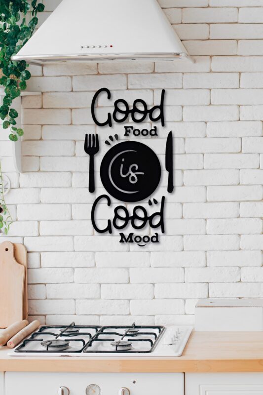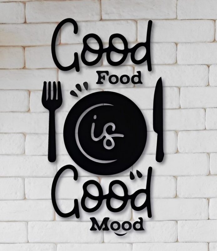 در روی این تابلو دیواری چوبی جمله Good Food is Good Mood برش خورده است. یک طرح کارد و چنگال و بشقاب در بین این جمله به چشم می خورد که به نوبه خود این تابلو را به یک تابلو هنری جذابه تبدیل کرده است.