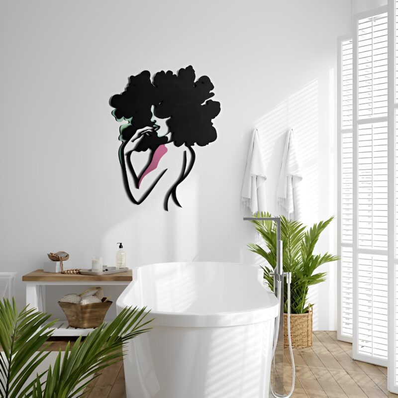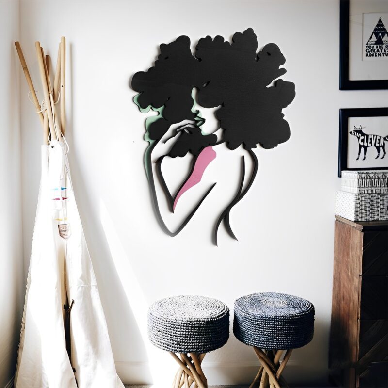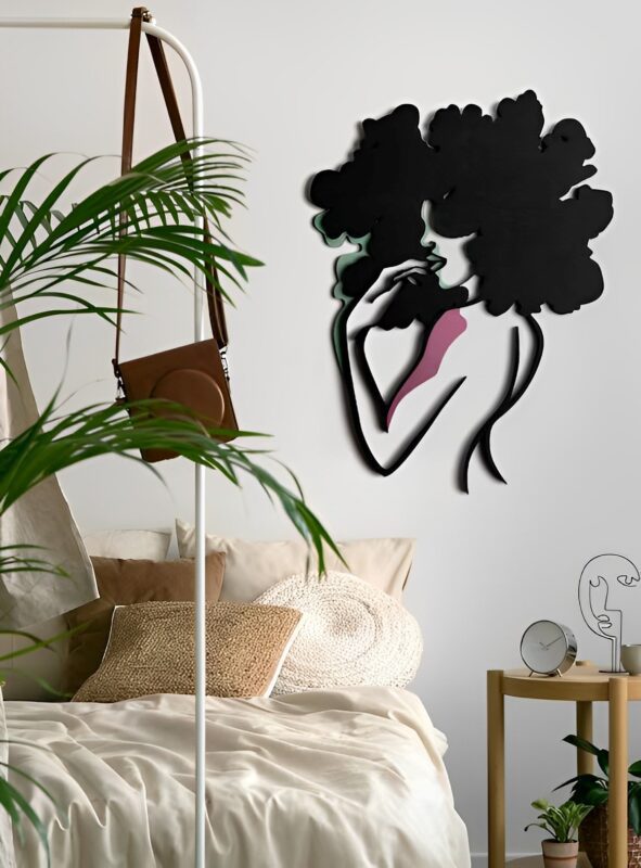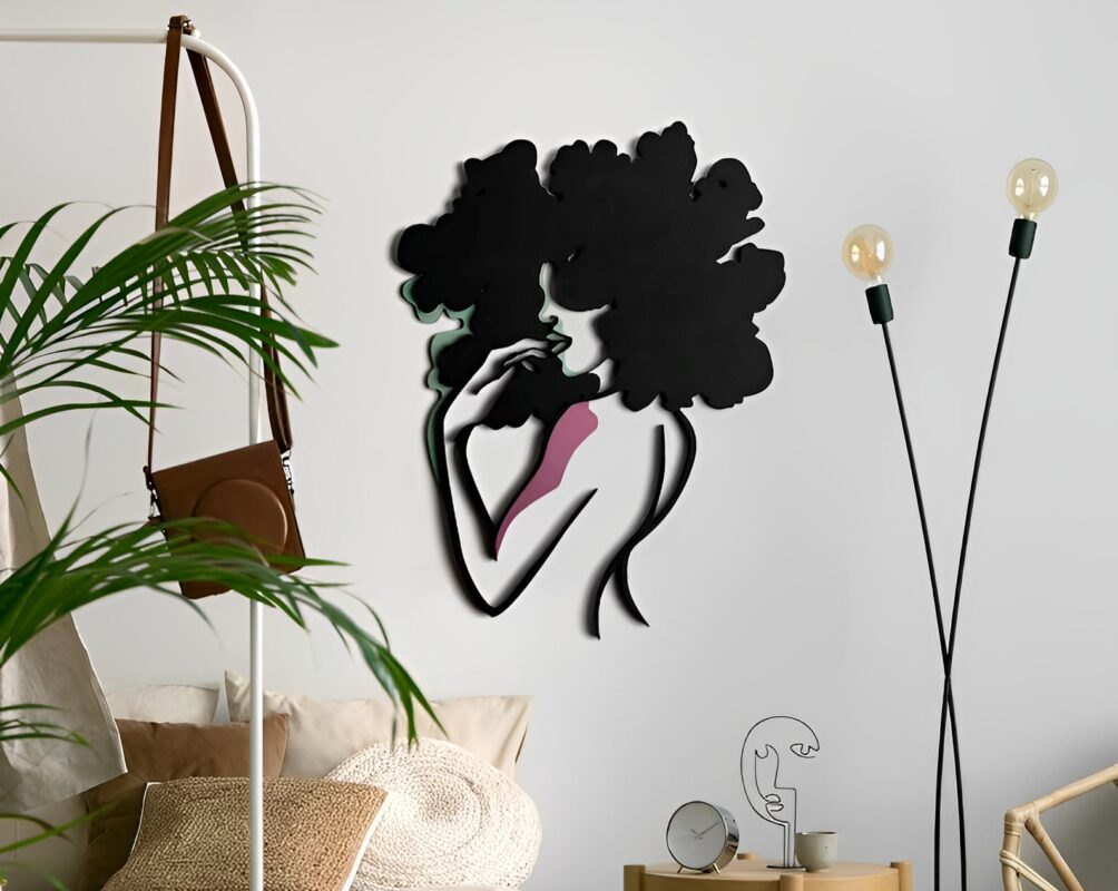 این تابلو دیواری چوبی دختر مو فرفری جذابی را به نمایش می گذارد و برای سایه های آن از رنگ صورتی و سبز و دخترانه استفاده شده است.