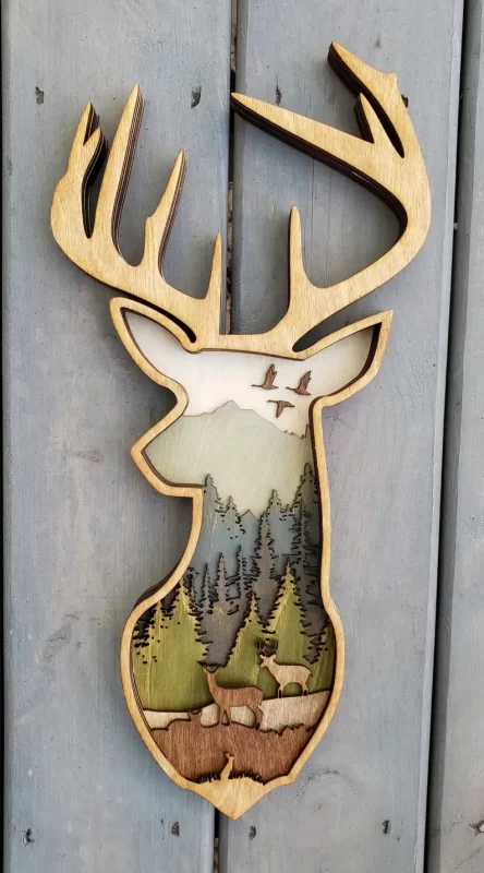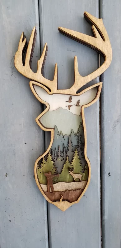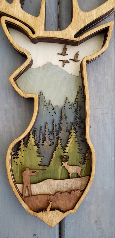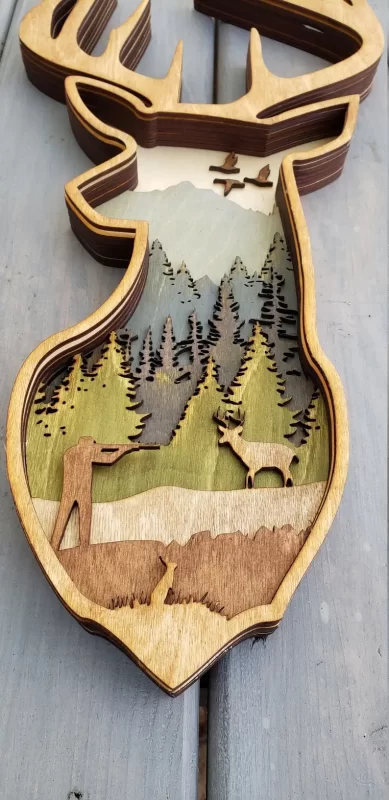 این تابلو دیواری دکوراتیو از به هم چسباندن 8 لایه متفاوت تشکیل شده است. هر کدام از این لایه های تابلو دیواری چوبی، یک المان منظره کوهستانی، پرندگان، جنگل، گوزن شاخ دار، شکارچی و خرگوش را نشان می دهد و در نهایت همه قطعات این تابلو هنری در یک قاب خاص و زیبا که به شکل گوزن شاخ دار است به نمایش در می آید.