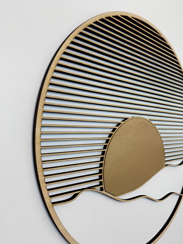 این تابلو دیواری چوبی در ابعاد مربع طراحی شده است و در مرکز آن خورشید زیبا دیده می شود؛ ترکیب مربع و دایره با هم در این تابلو خاص و زیبا ترکیب بی نظیر و خارق العاده ای آفریده است.