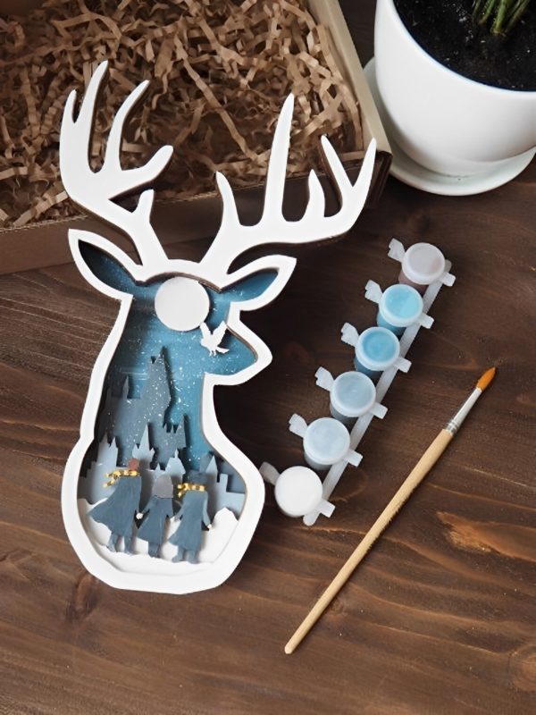 این تابلو دیواری دکوراتیو از به هم چسباندن چند لایه متفاوت تشکیل شده است. هر کدام از این لایه های تابلو دیواری چوبی، دارای المان ماه، پرنده، جنگل، قصر و سه دوست، شب برفی و خانه و … است و همه قطعات این تابلو دیواری در یک قاب خاص که به شکل گوزن شاخ دار است به نمایش در می آید.
