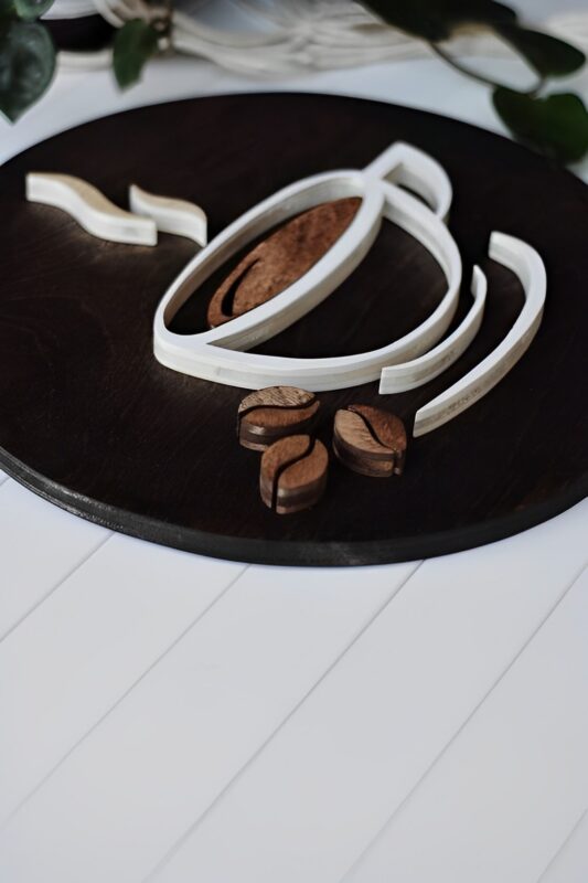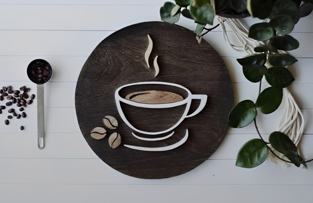 این تابلو چوبی شیک و ساده با استفاده از المان های فنجان قهوه داغ و دانه های قهوه تزیین شده است. این تابلو می تواند نمایانگر شغل و حرفه خاص شما باشد😍😍.