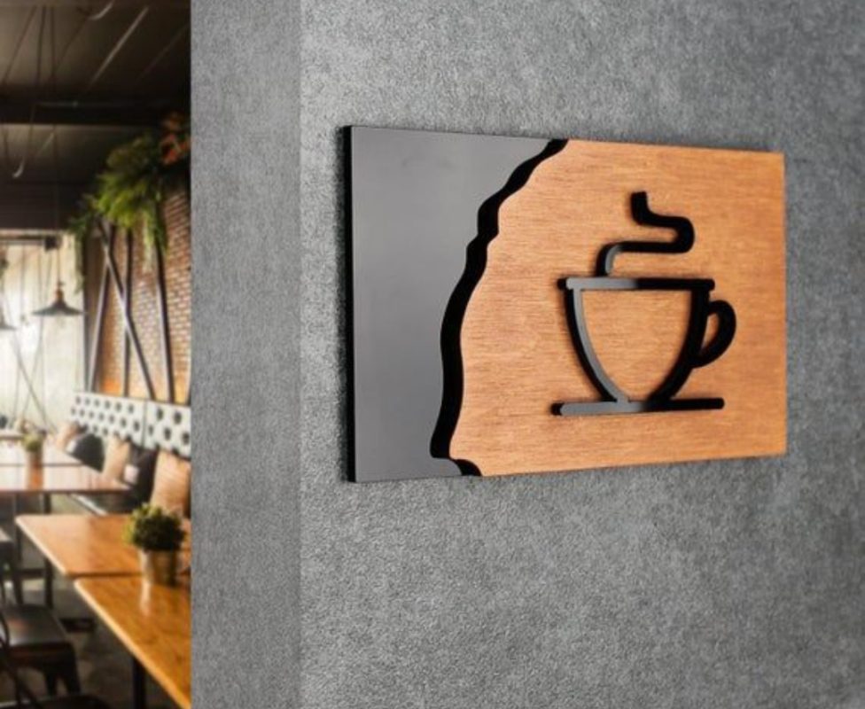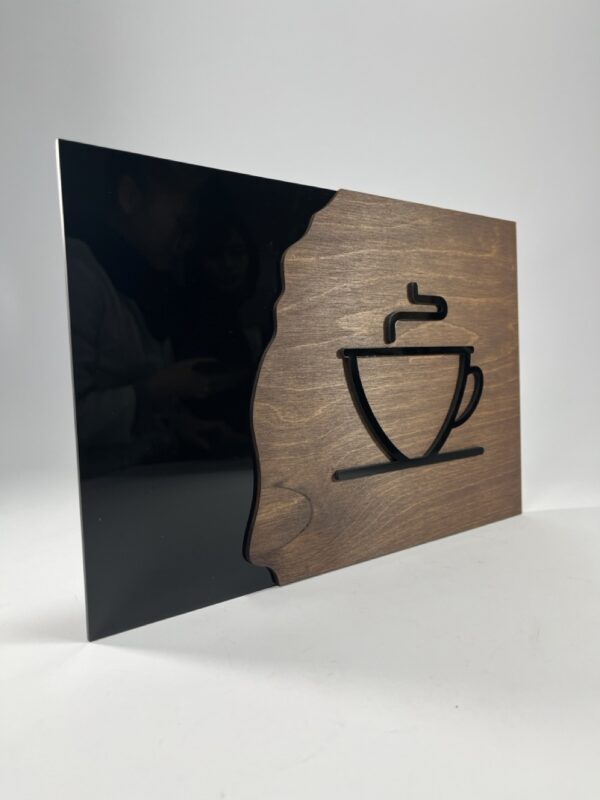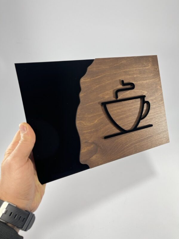 تابلو حکاکی و برش لیزری شده از متریال چوب و پلکسی با طرح فنجون قهوه مناسب برای کافه ها و رستوران ها و یا در آشپزخانه