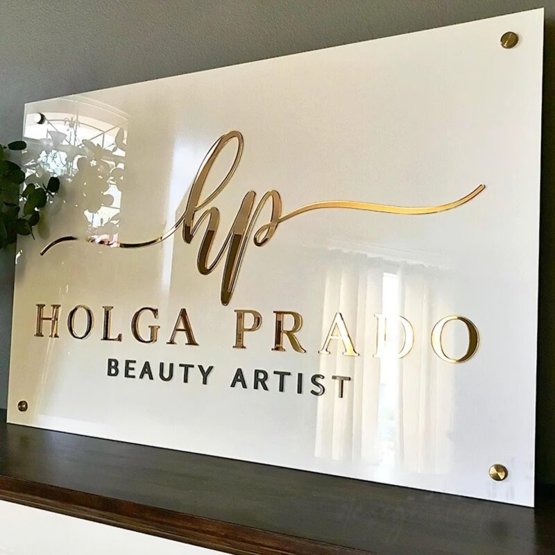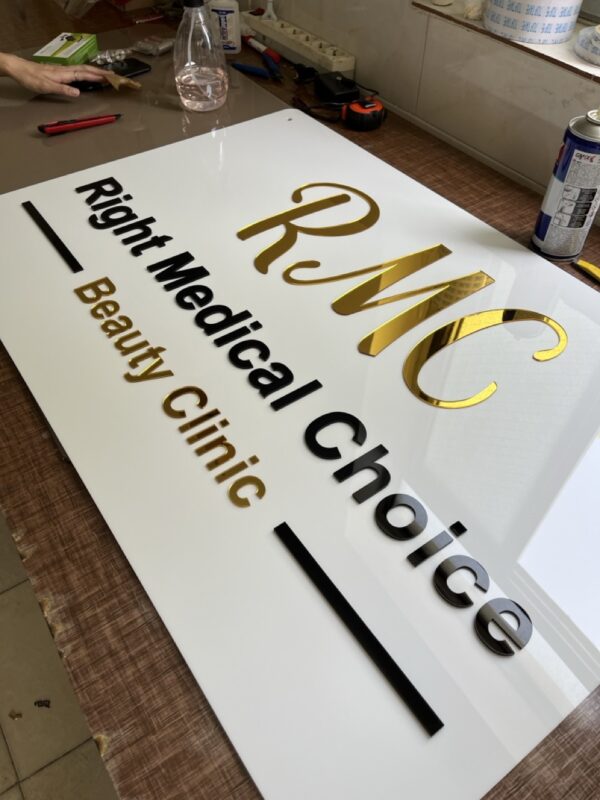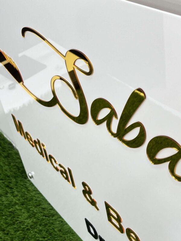 تابلو از پلکسی گلاس سفید ساخته شده که در ترکیب با حروف برجستهی طلایی و مشکی، هویتی خاص به برند میبخشد. نصب آن بهصورت دیواری و با اتصالات فلزی انجام میشود که ظاهر مدرن و تمیز آن را تکمیل میکند.