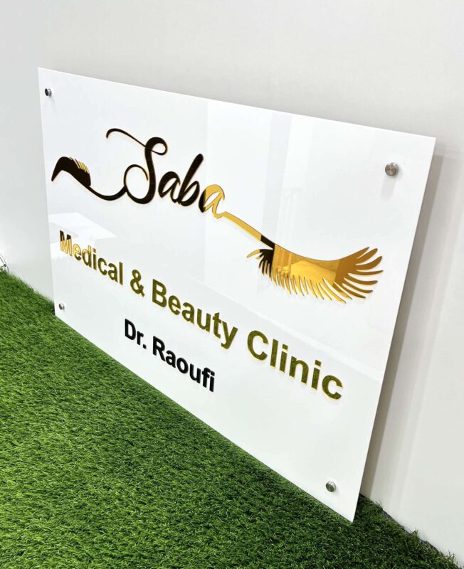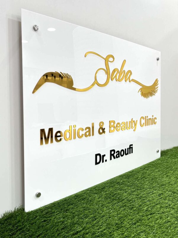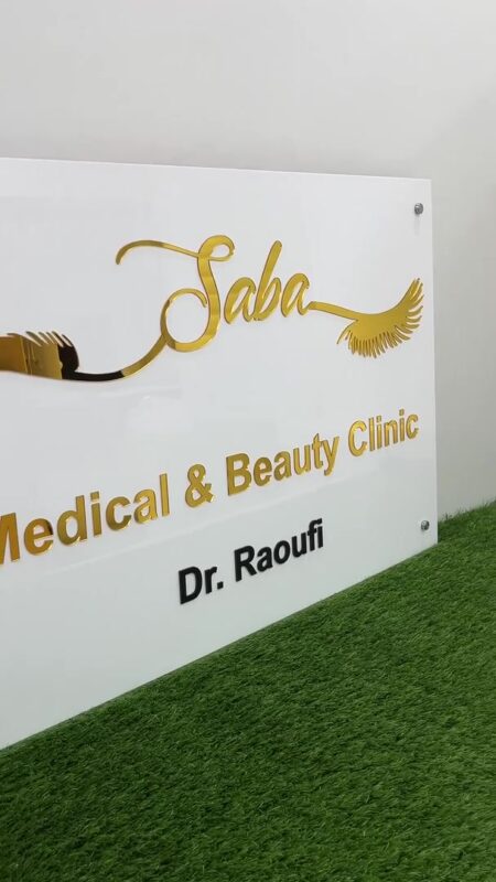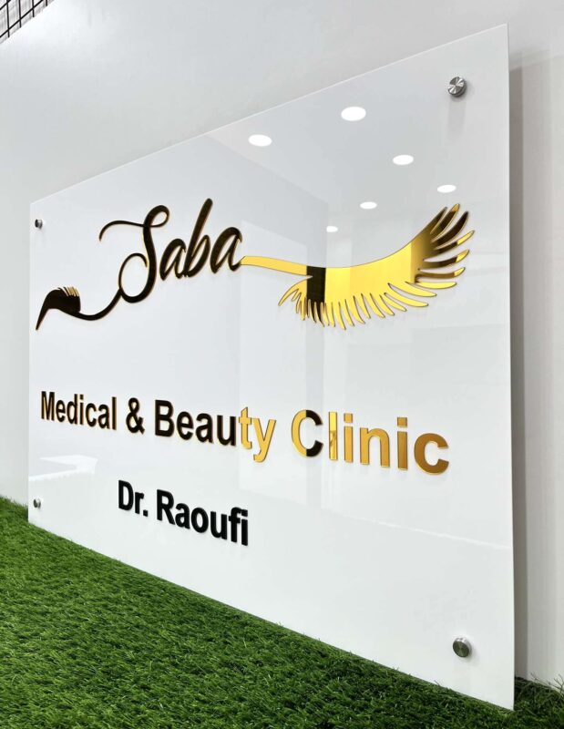 طراحی خاص لوگوی “Saba” با ترکیب حروف خوشنویسیشده و یک عنصر گرافیکی به شکل مژه، حس زیبایی، سلامت و دقت را به مخاطب منتقل میکند. نوشته “Medical & Beauty Clinic” بهصورت برجسته و ترکیب رنگ طلایی و مشکی روی تابلو نقش بسته و در قسمت پایین، نام پزشک «Dr. Raoufi» با فونت مشکی خوانا حک شده است.