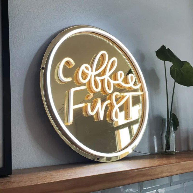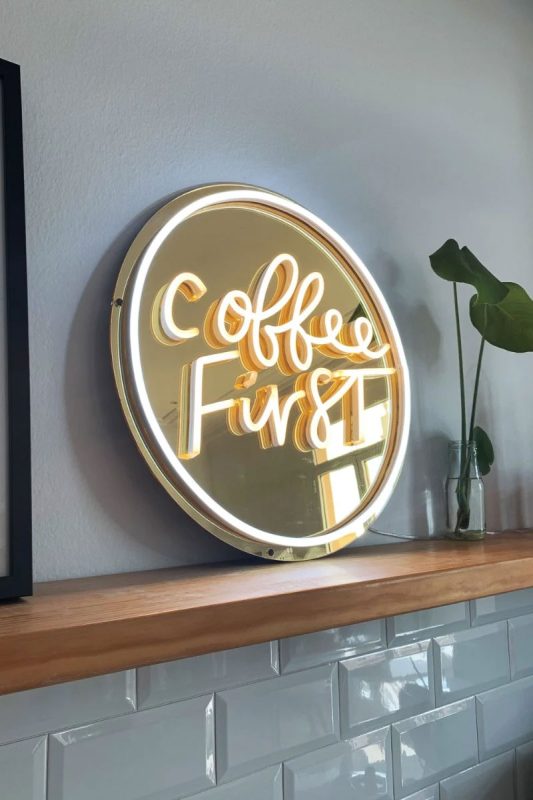 این تابلو نئون فلکس دارای نور سفید گرم روی قسمت «Coffee First» به همراه نور سفید دور آینه دایره ای طلایی است. لطفا توجه داشته باشید که این محصول با آینه شیشه ای سنگین سنتی ساخته نمی شود.
