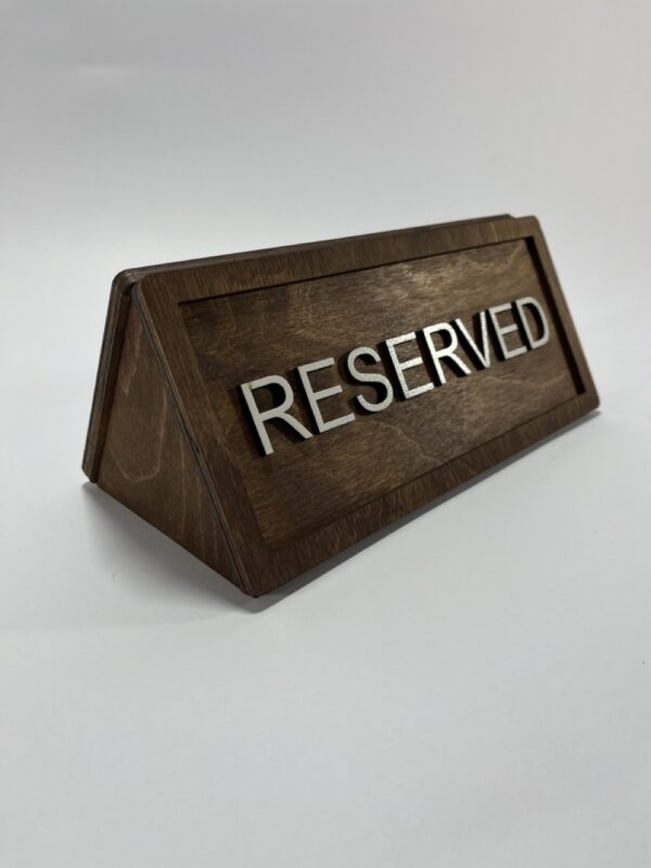 این تابلو پلاک رزرو چوبی در فرم منشور سه وجهی طراحی شده است. می توانید در کناره های این تابلو پلاک رزرو منشوری لوگو، نام مغازه و یا برند تان را به صورت شخصی سازی شده داشته باشید. فقط کافیست باکس های قرار داده شده در سایت را پر کنید تا محصولی که به دست تان می رسد به صورت کاملا شخصی سازی شده باشد.