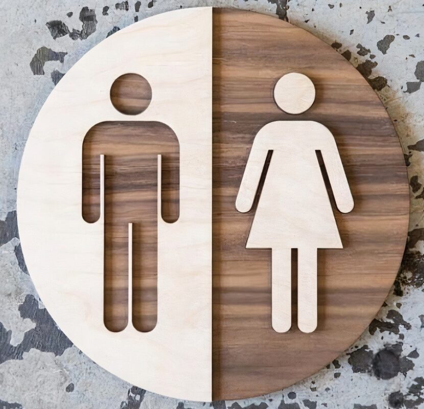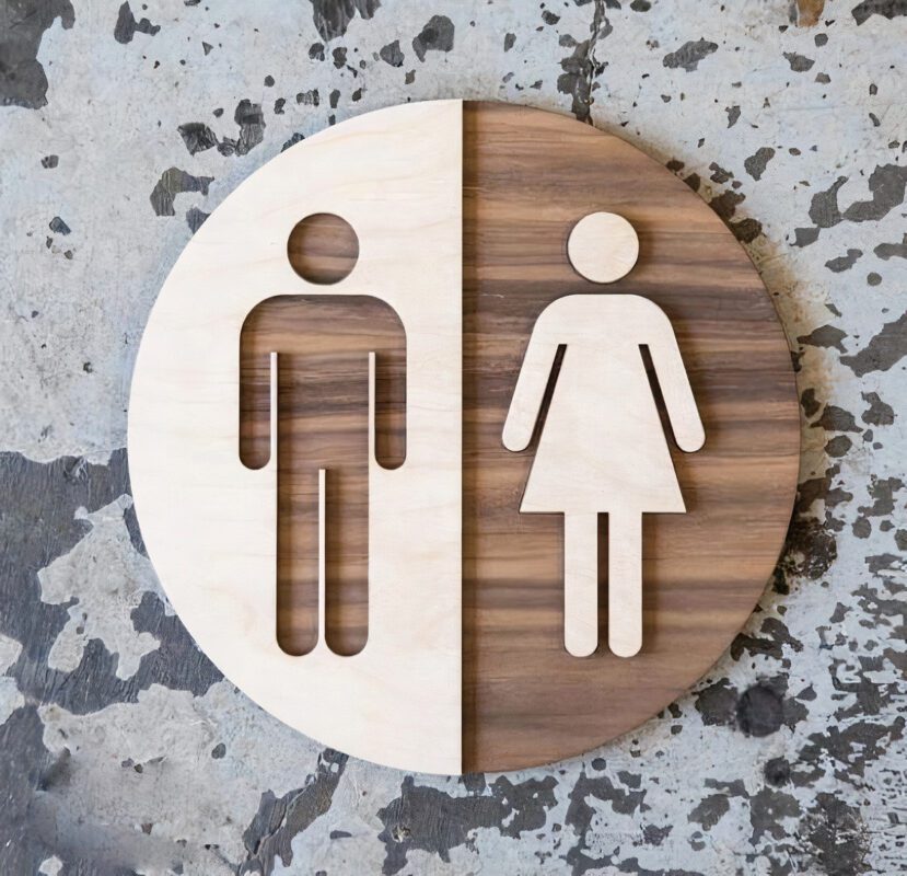 این تابلو پلاک سرویس بهداشتی برش لیزری در فرم دایره طراحی و با استفاده از دو رنگ متفاوت تزیین شده است. المان های به کار رفته در این محصول به صورت گرافیکی است و به خوبی قسمت مردانه و زنانه را از هم تفکیک کرده است.