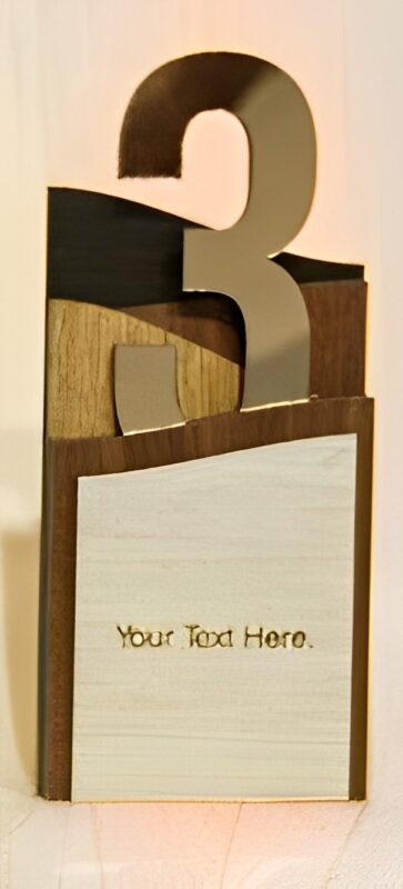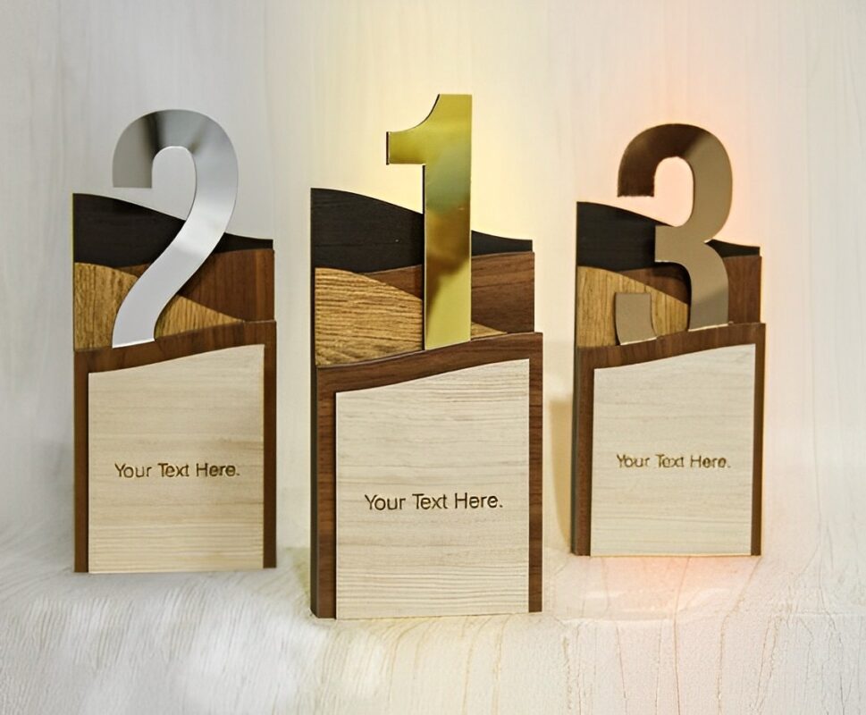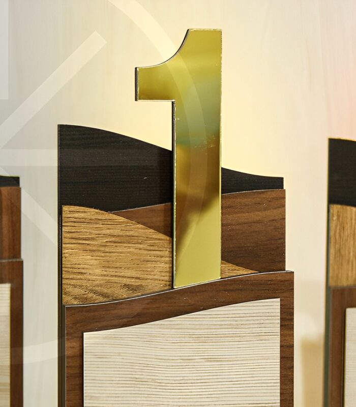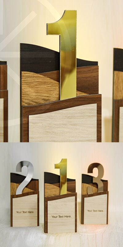 این تندیس افتخار چوبی خاص در 3 طرح نفر اول، دوم و سوم طراحی و تولید شده است. در قسمت پایین این تندیس افتخار برش لیزری قسمتی قرار دارد که ما می توانیم با لوگو، نام نام خانوادگی، و متن مورد نظرتان این محصول را به رایگان برای شما سفارشی سازی کنیم. فقط کافیست باکس توضیحات سفارش موجود در سایت را پر کنید تا محصولی که به دست تان می رسد به صورت 100 درصد سفارشی سازی شده باشد.