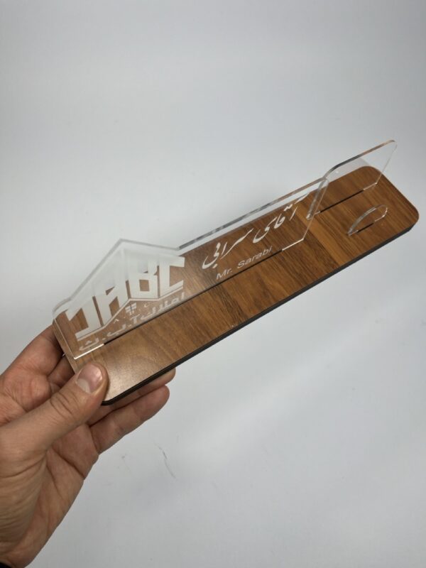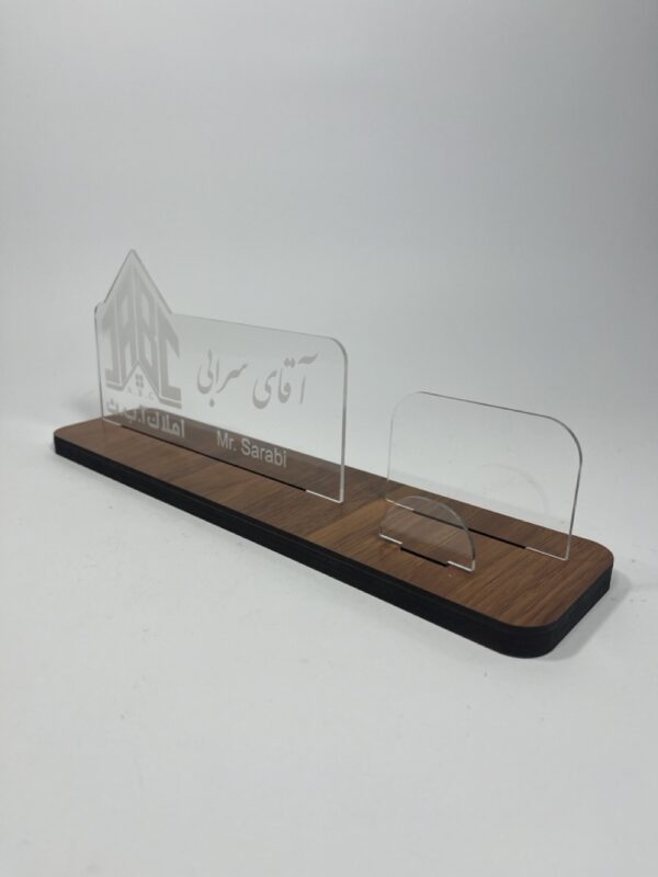 در کنار این جاکارتی چوبی یک استند اسم پلکسی طراحی شده که می توانید نام خودتان، مغازه و یا برند تان و متن کوتاه مورد نظرتان را به صورت شخصی سازی شده داشته باشید. فقط کافیست باکس قرار داده شده در سایت را پر کنید تا محصولی که به دست تان می رسد به صورت کاملا شخصی سازی شده باشد.