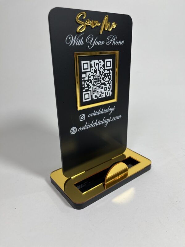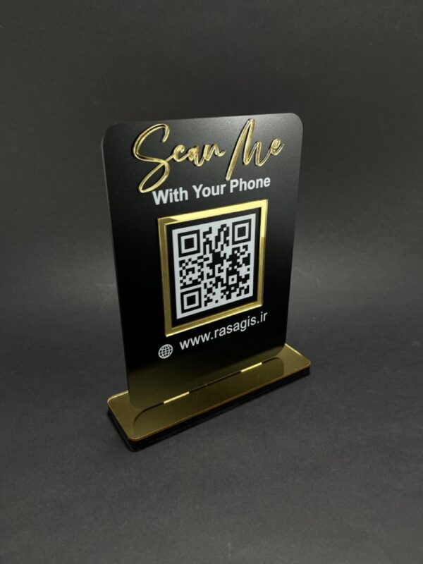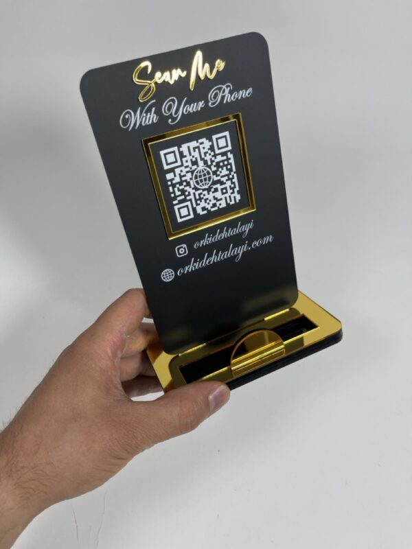 جلوهای باورنکردنی از هنر و ذوق در جاکارتی و استند QR CODE مدل TH_28912 با زمینه مشکی و پایهای درخشان به رنگ طلایی. این ترکیب رنگی به محصول شما لمسی از شیکترین طراحی را میبخشد.