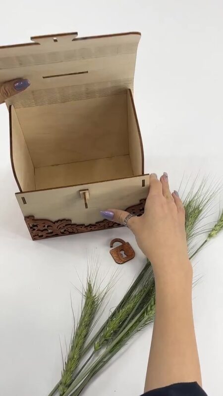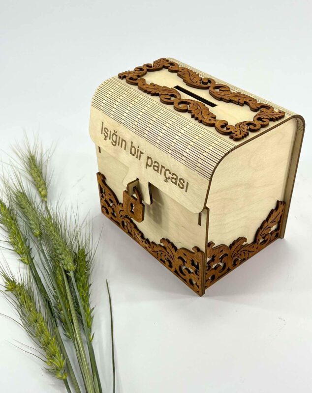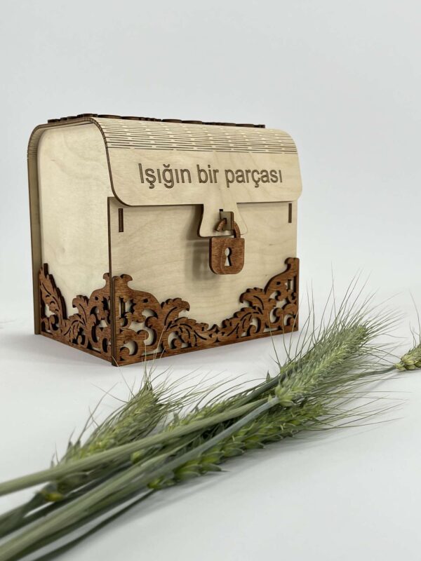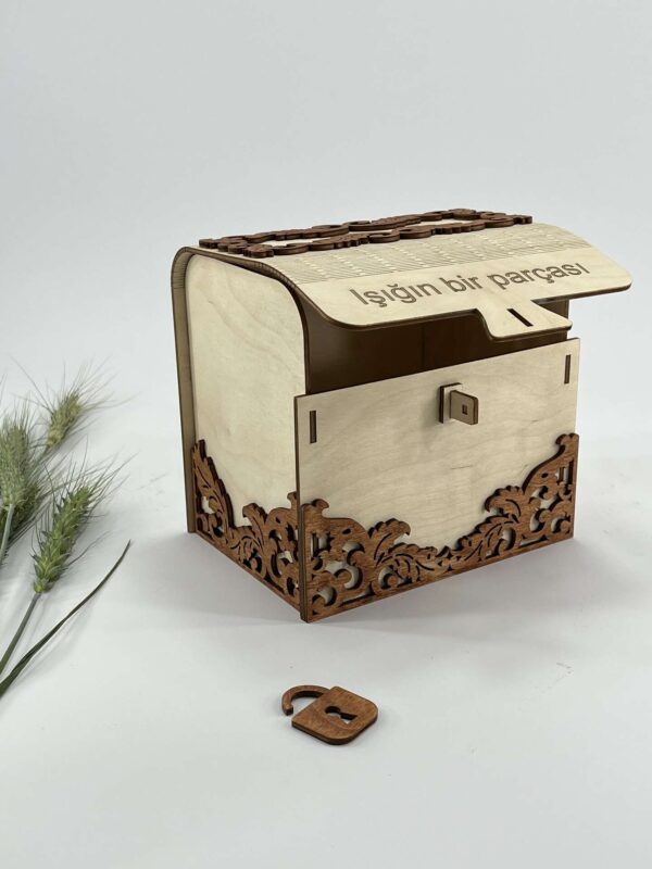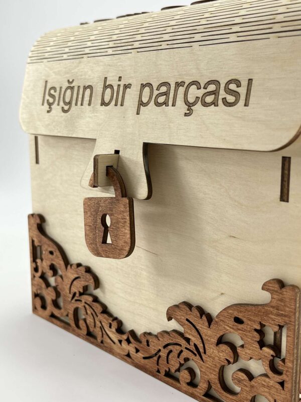 برشها و حکاکیهای لیزری دقیق، قفل چوبی تزئینی، و نوشته ظریف روی درب این صندوقچه، اون رو به یه گزینه عالی برای هدیه دادن تبدیل کرده. متن روی محصول به زبان ترکی “Işığın bir parçası” هست که یعنی “قطعهای از نور” – چه چیزی بهتر از این برای نگهداری خاطرهها؟ 🌟