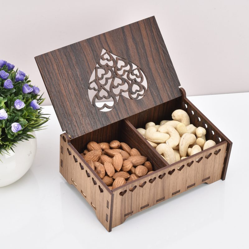 جعبه پذیرایی حکاکی و برش لیزری شده طرح دار مناسب برای قراردادن انواع آجیل ، شکلات ، میوه خشک و خشکبار و یا چای تی بگ و انواع دمنوش بر روی میز که نظم خاصی به آنها خواهد بخشید و زیبایی خاصی به میز شما خواهد داد.