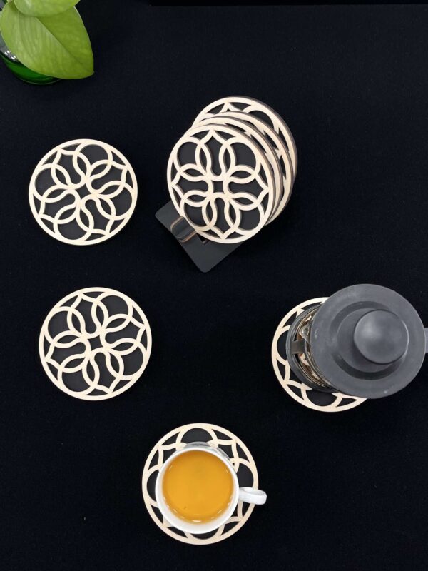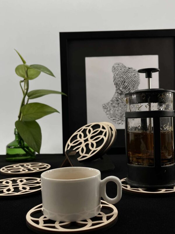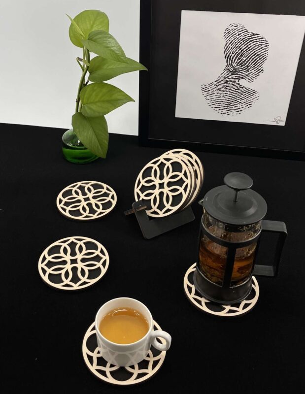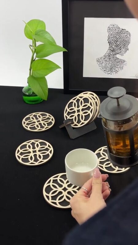 هر زیرلیوانی به شکل دایرهای طراحی شده و با طرح گلمانند هندسی برش خورده. رنگ طبیعی چوب روشن و تیره، جلوهای دکوری بهش داده. بههمراه استند ایستاده برای نظمدهی بهتر ارائه میشه.
