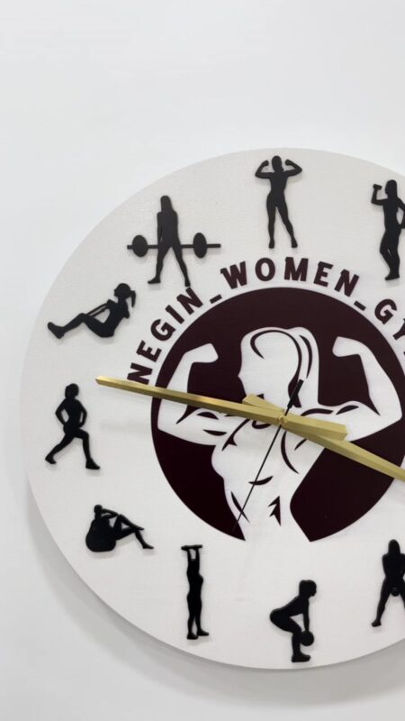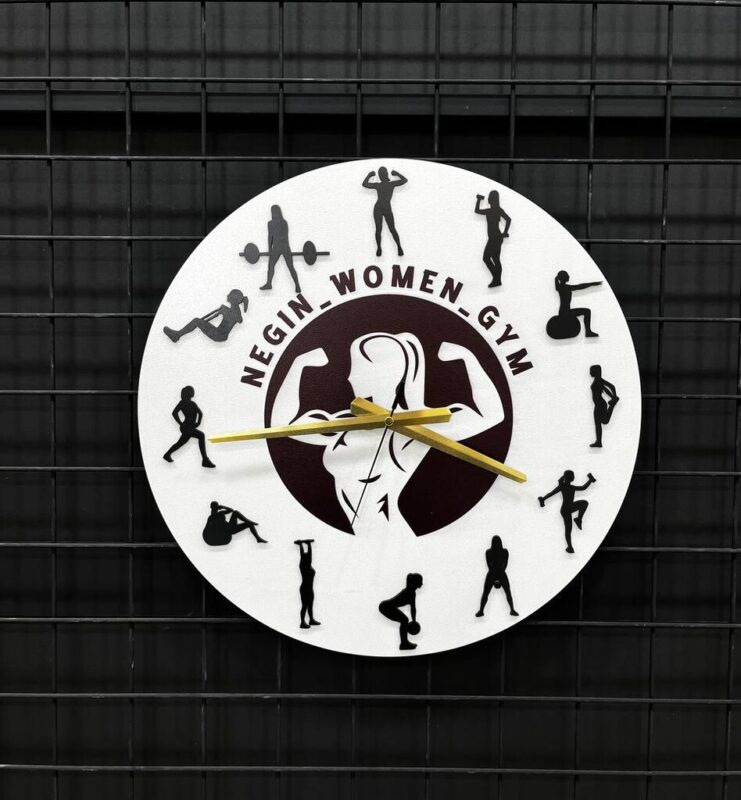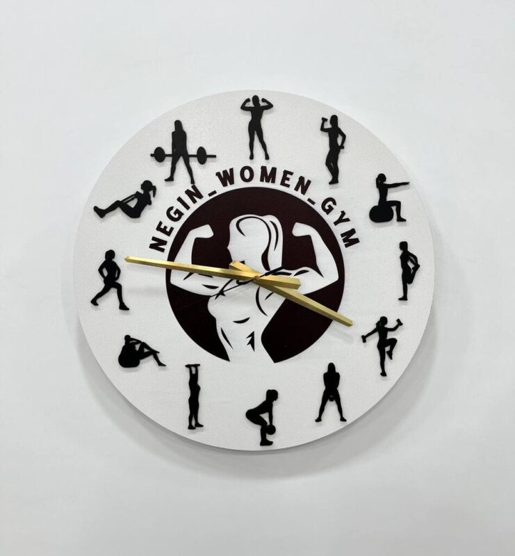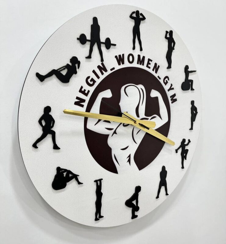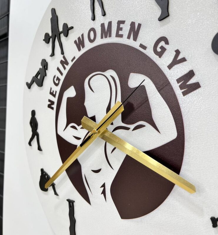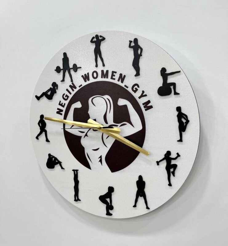 صفحهی ساعت دایرهای شکل از MDF خام با ضخامت ۳ میلیمتر ساخته شده. رنگ سفید با عناصر برجستهی مشکی (فیگورهای تمرینی) ترکیب شده و در مرکز، تصویر بانوی ورزشکار همراه با نام مجموعه یا باشگاه حک شده. عقربهها به رنگ طلایی طراحی شدهاند.