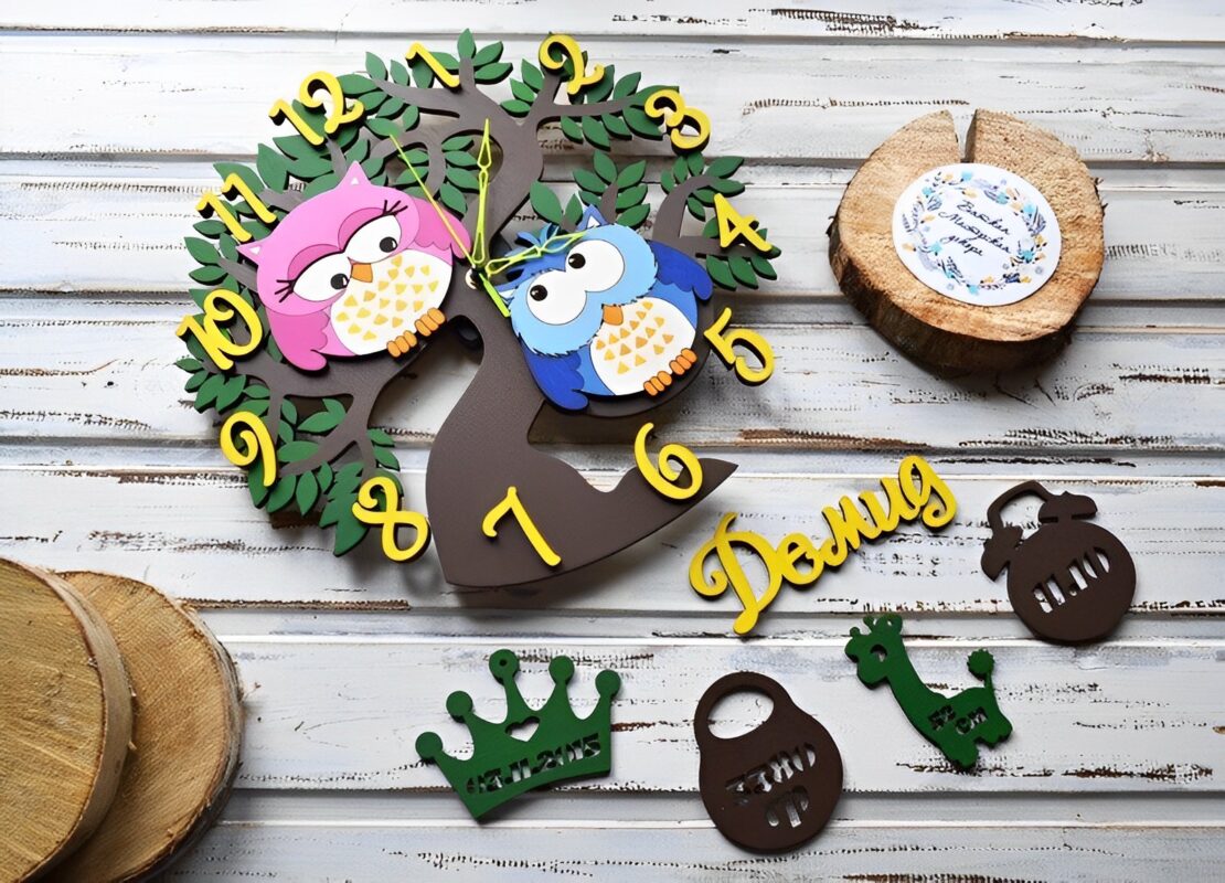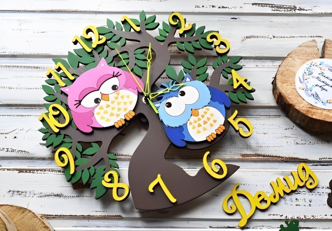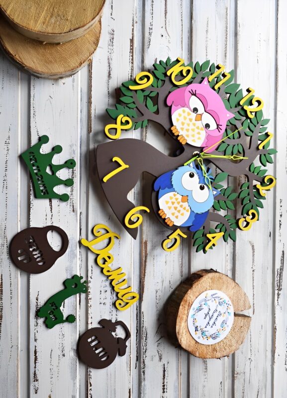این ساعت دیواری چوبی با المان های جغد پسر و جغد دختر و درخت تزیین شده است و اعدادی که در روی این محصول طراحی شده است با رنگ زرد رنگ آمیزی شده و با رنگ سبز برگ ها تضاد جالبی ایجاد کرده و باعث شده به راحتی اعداد روی ساعت خوانده شود. این محصول ایده ای بسیار عالی برای تزیین مهد کودک با تم جنگل است.