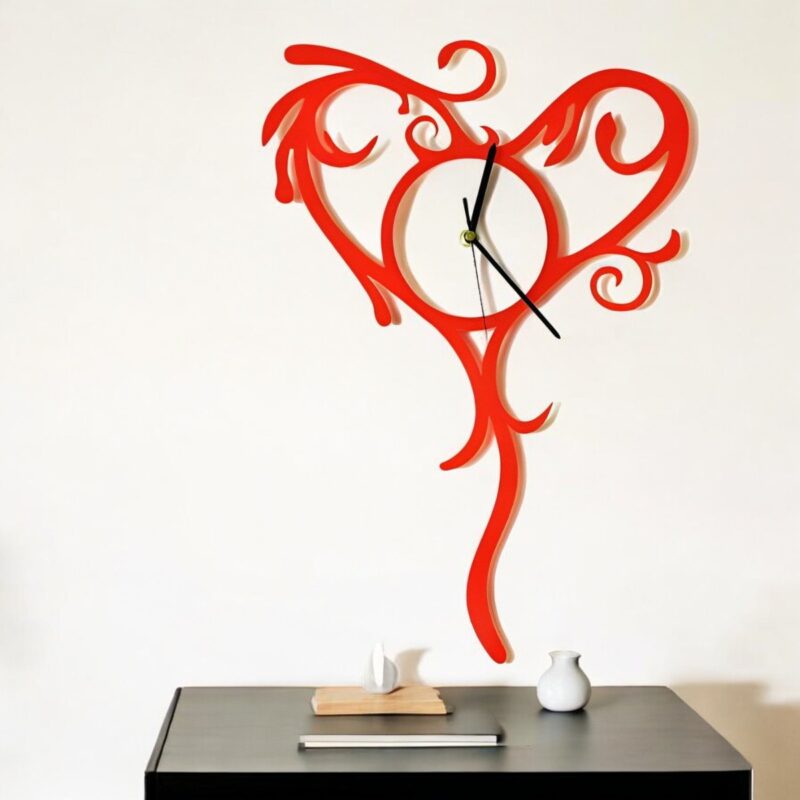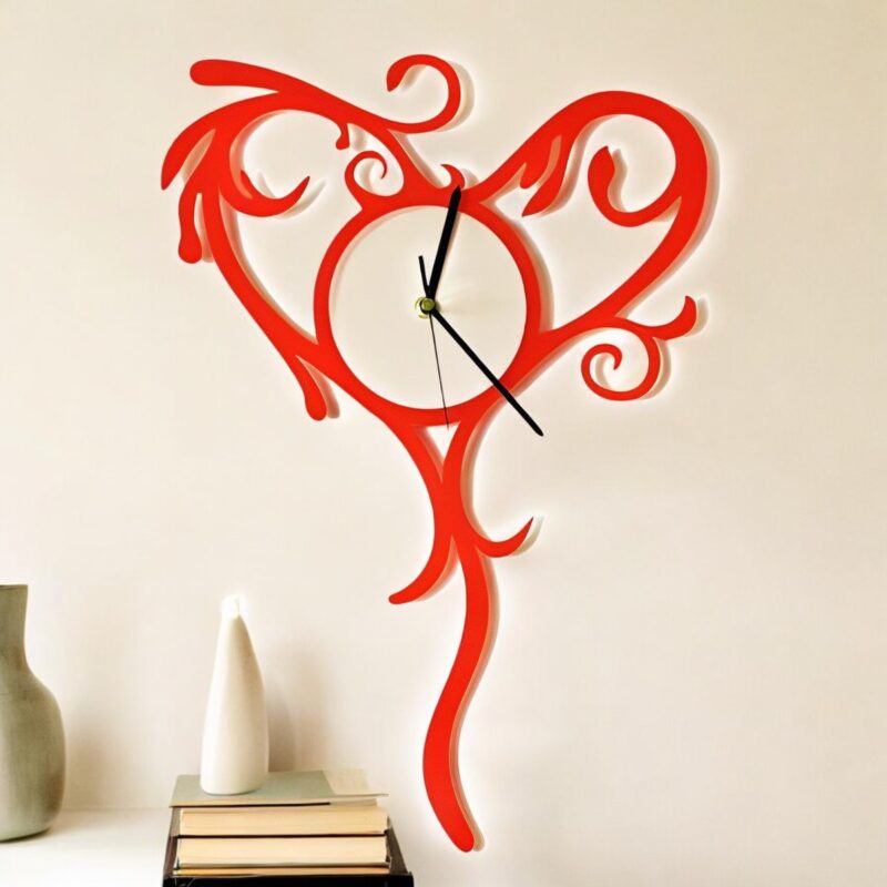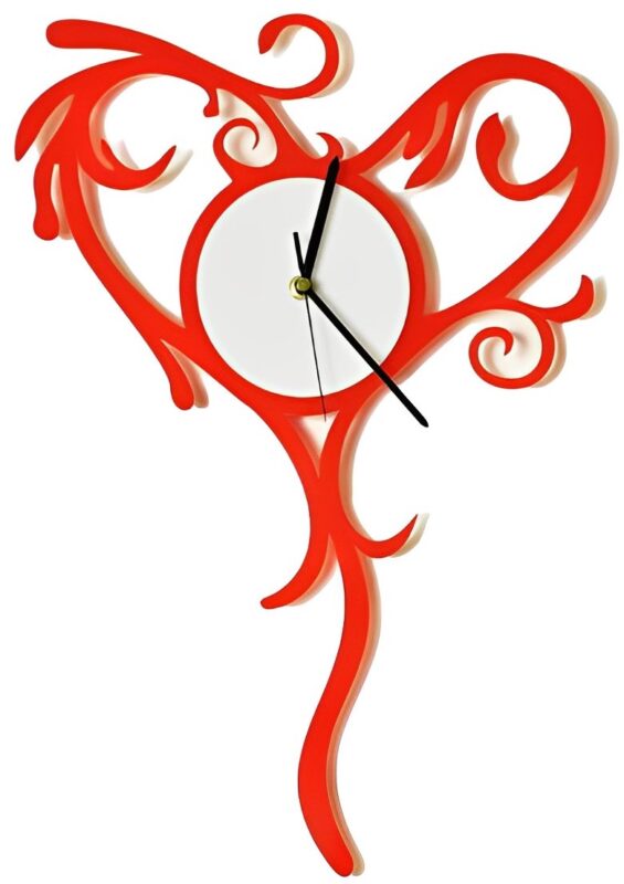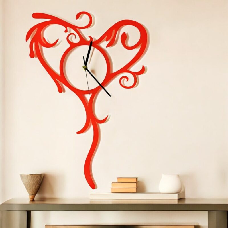 این ساعت دیواری چوبی داری طراحی فانتزی است و با اسپیرال و پیچک های غربی تزیین شده و عقربه های آن از فرم دایره ساعت، بلند تر است و از قاب آن بیرون زده است. این ساعت دیواری برای هدیه دادن خصوصا مناسب های خاص مثل ولنتاین و … بسیار مناسب است.