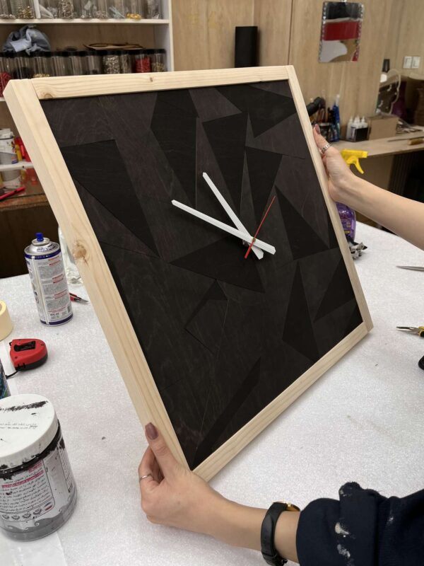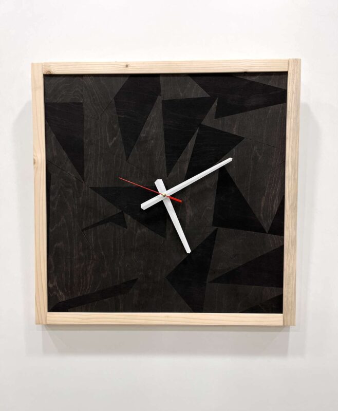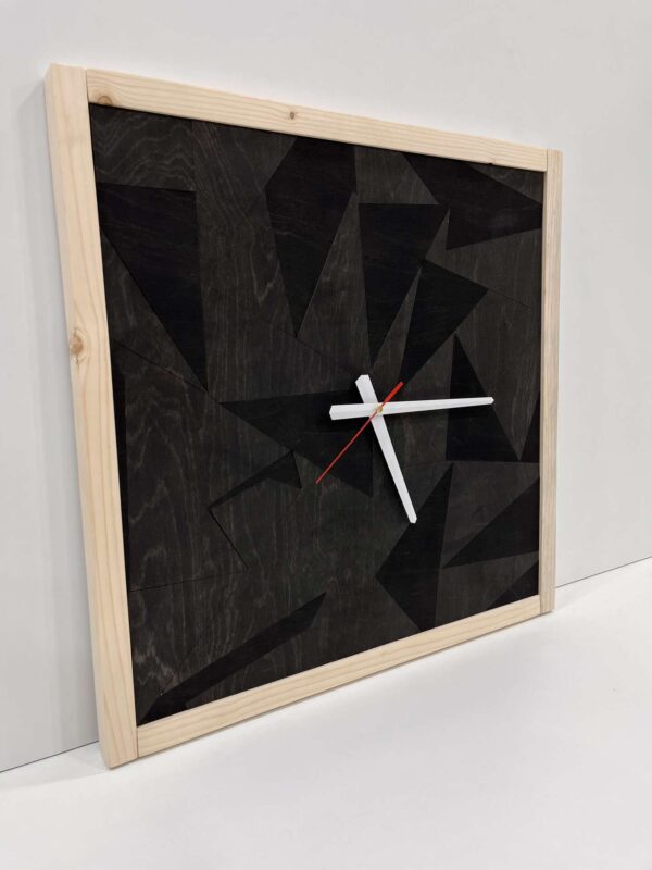 این ساعت به شکل مربعی طراحی شده، با قاب چوب طبیعی پرداختشده و سطح داخلی از چوب سهلایه با طرحهای زاویهدار چسباندهشده و رنگآمیزی دستی است. ترکیب رنگ تیره صفحه با عقربههای سفید و قرمز، جلوهای بسیار چشمگیر و خاص ایجاد کرده است.