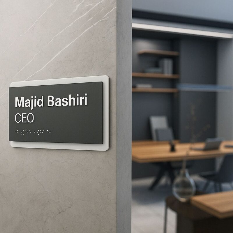 از جذابترین ویژگیهای این محصول استفاده از خط بریل در بخش پایینی پلاکه که اون رو برای افراد دارای اختلال بینایی هم کاربردی میکنه ♿. این یعنی شما در عین حفظ زیبایی بصری، دسترسیپذیری محیط رو هم در نظر گرفتی — و این فوقالعادهست! 🌟