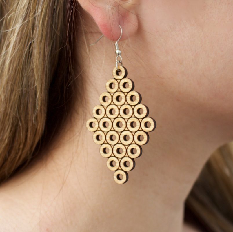 گوشواره حکاکی و برش لیزری شده از متریال چوب که یک محصول زیبا و خاص برای کادویی دادن ایجاد کرده است.