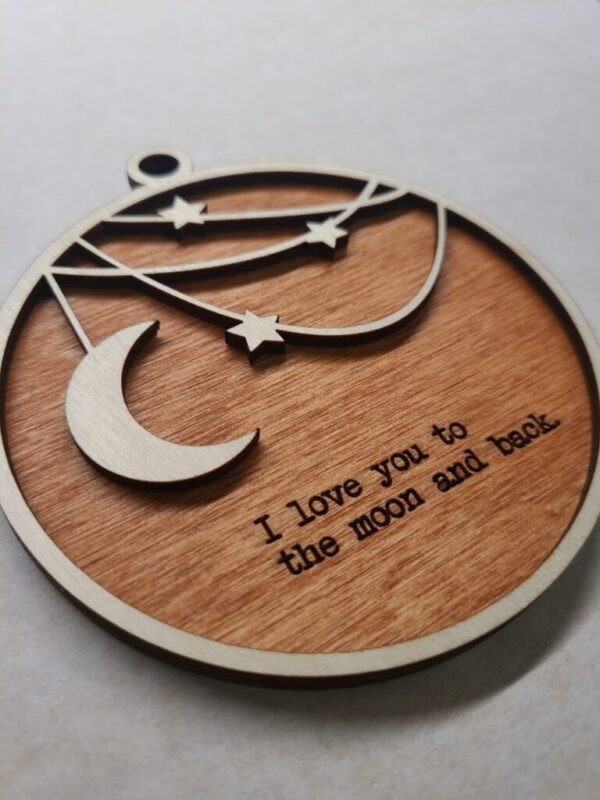 این آویز زیبا و ظریف از چوب سهلایه ساخته شده و با طراحی ماه و ستارهها، حس رمانتیک و لطیفی را به فضا منتقل میکند. متن حکاکی شده روی آن با جملهٔ «I love you to the moon and back» نهتنها جلوهای خاص به محصول داده، بلکه آن را به هدیهای پرمعنا و ماندگار تبدیل کرده است. آویز دکوراتیو چوبی عاشقانه مدل TH_14260 با برش لیزری دقیق و پرداخت تمیز، انتخابی فوقالعاده برای علاقهمندان به هنرهای چوبی و دکورهای دستساز است. ✨🌙💛