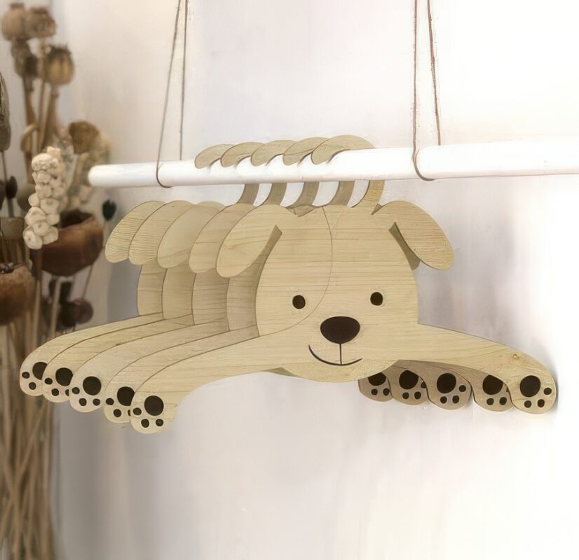 این آویز چوبی به شکل یک سگ بازیگوش طراحی شده که دستان و پاهایش به صورت قلابهای ظریف و کاربردی برای آویختن لباسها به کار میروند.