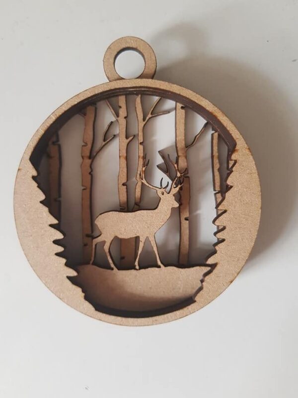 این آویز از MDF با ضخامت ۳ میلیمتر ساخته شده و دارای طراحی چندلایه با فرم دایرهای و قلاب بالایی برای آویختن است. برشها دقیق و تمیز انجام شدهاند و نمای جنگل و گوزن بهصورت سهبعدی و طبیعی دیده میشه.