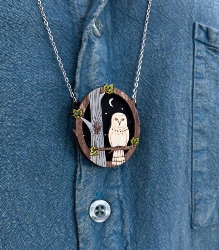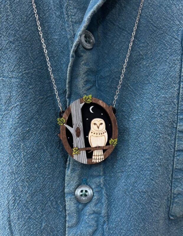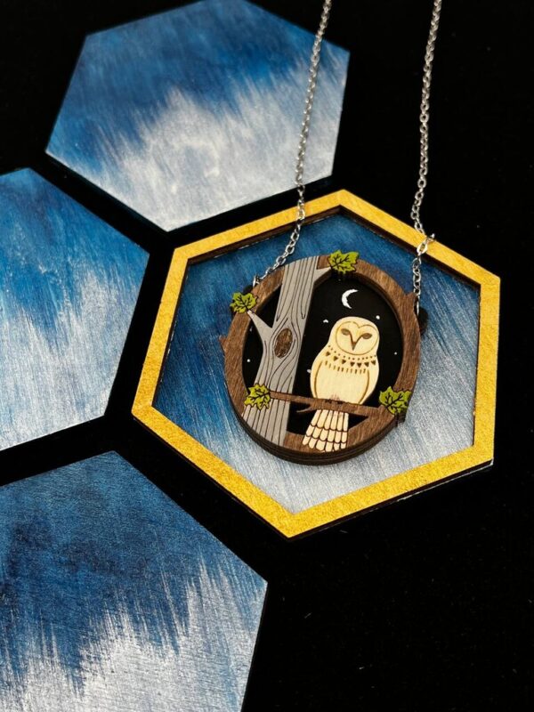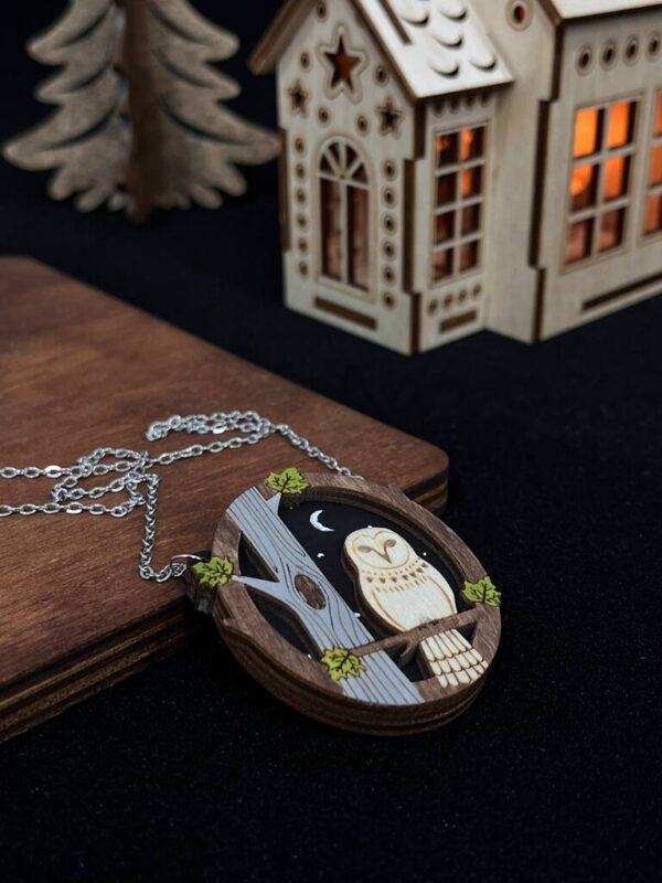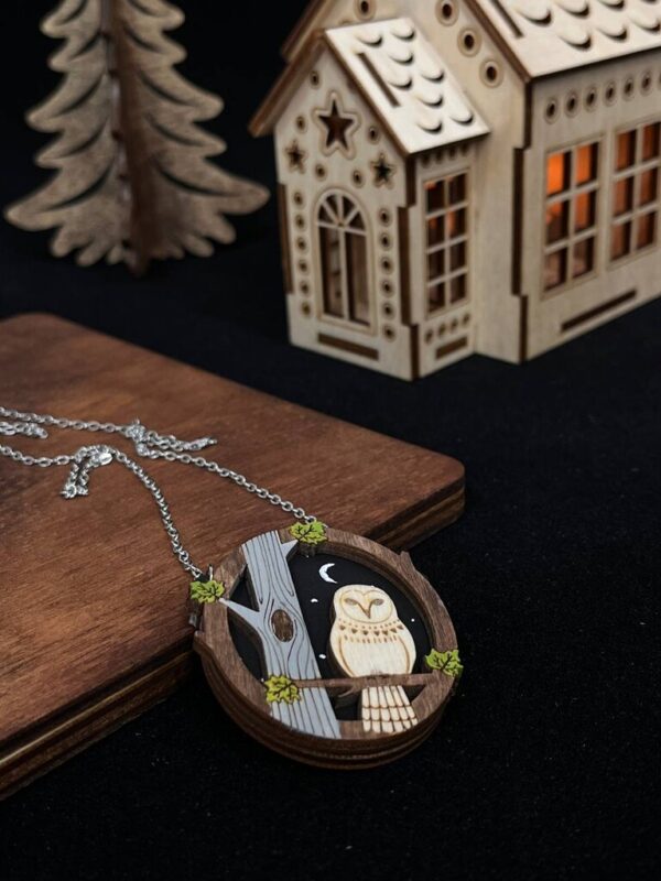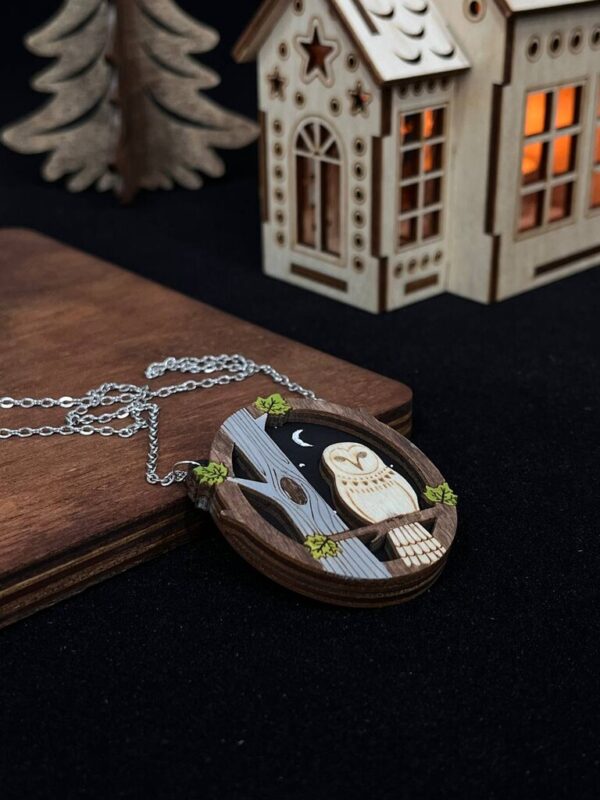 گردنبند و آویز به شکل بیضی طراحی شده و شامل تصویر جغد ایستاده روی شاخه، با پسزمینهای شبانه، ماه و ستارههاست. چوب در سه لایه ظریف با رنگهای طبیعی کار شده و برگهای سبز کوچکی هم به طراحی جلوه دادهاند.