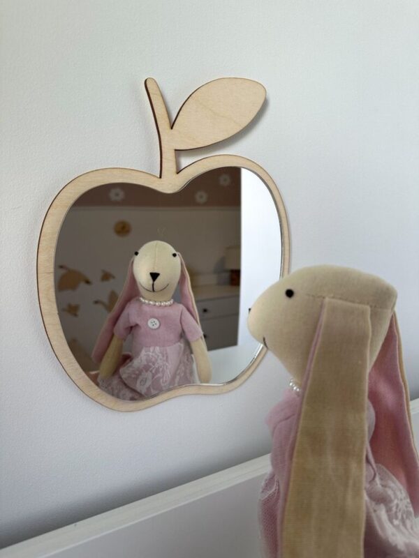 قاب چوب سهلایه رنگآمیزی شده به شکل سیب، آینه پلکسی شفاف و مقاوم، طراحی نرم و ایمن مناسب فضای کودکانه.