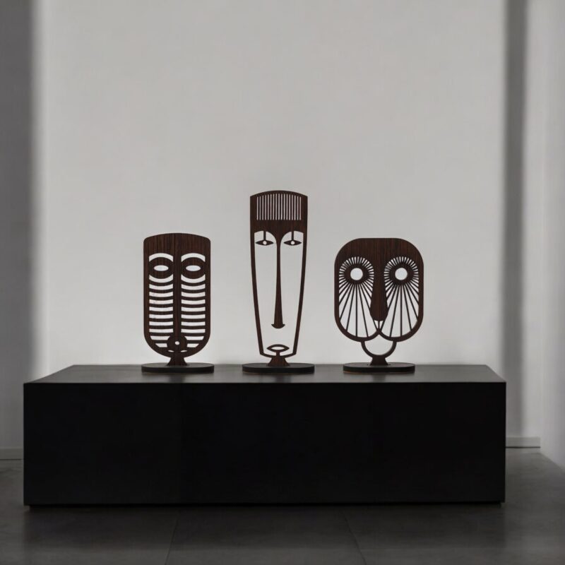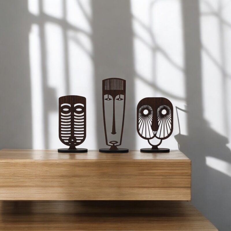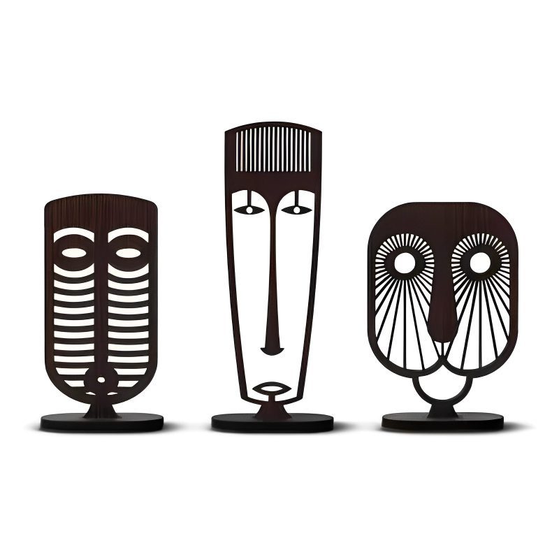 استند رومیزی طرح ماسک مدل TH_83693 دارای 3 مدل ماسک است که طراحی هر کدام با دیگری متفاوت است. این استند رومیزی با الهام از ماسکهای آفریقایی طراحی شده است. قبایل آفریقایی از این صورتک ها برای مراسم مذهبی و ازدواج و … استفاده می کنند.