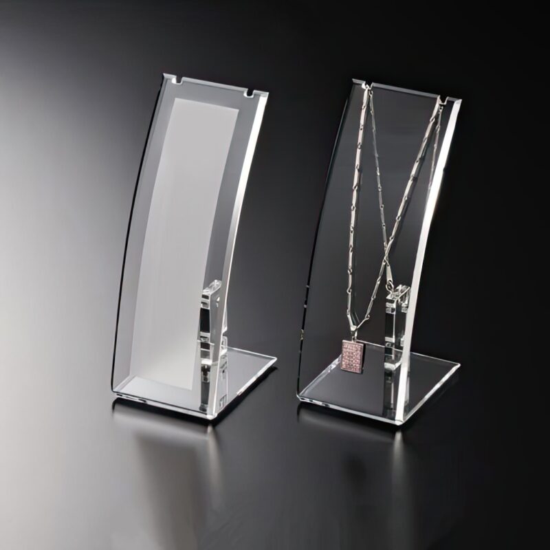 این استند دارای طراحی منحنی با پایه صاف است. از جنس پلکسی شفاف ۳ میلیمتری ساخته شده که در برابر نور جلوهای براق و خاص دارد. ابعاد استاندارد آن برای نگهداری انواع گردنبند و زنجیر مناسب است و بهراحتی قابلجابهجایی است.